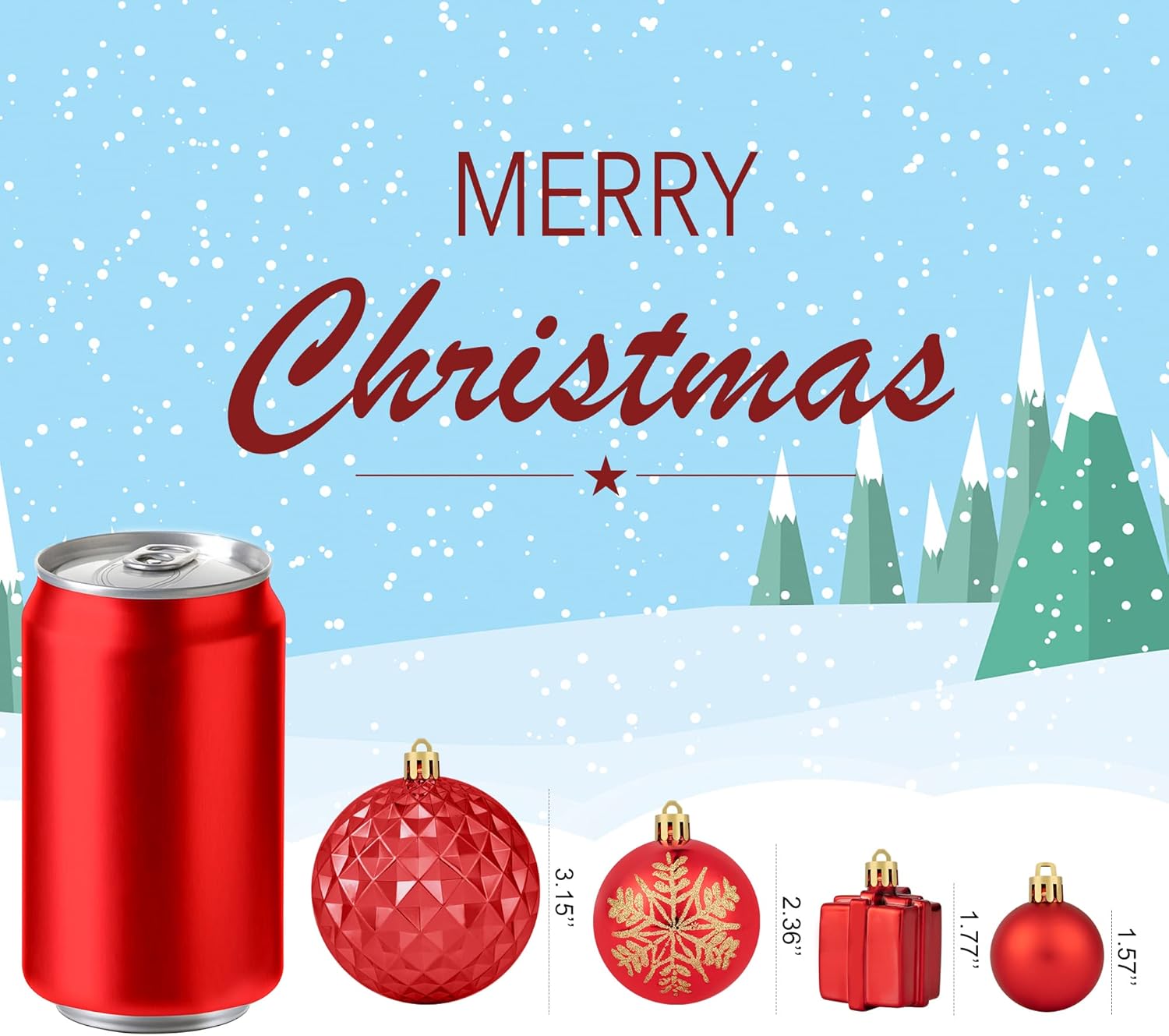 • 【Christmas Ball Ornaments】 This red assorted Christmas ornament set contains 116PCS of Christmas balls in 18 styles, includes various shapes, sizes, such as 1.57” / 2.36” / 3.14” Christmas ball, stocking , bell, and gift. It's your call to complete your Christmas decoration with these beautiful balls ornaments set, and make the Christmas season more memorable and unique