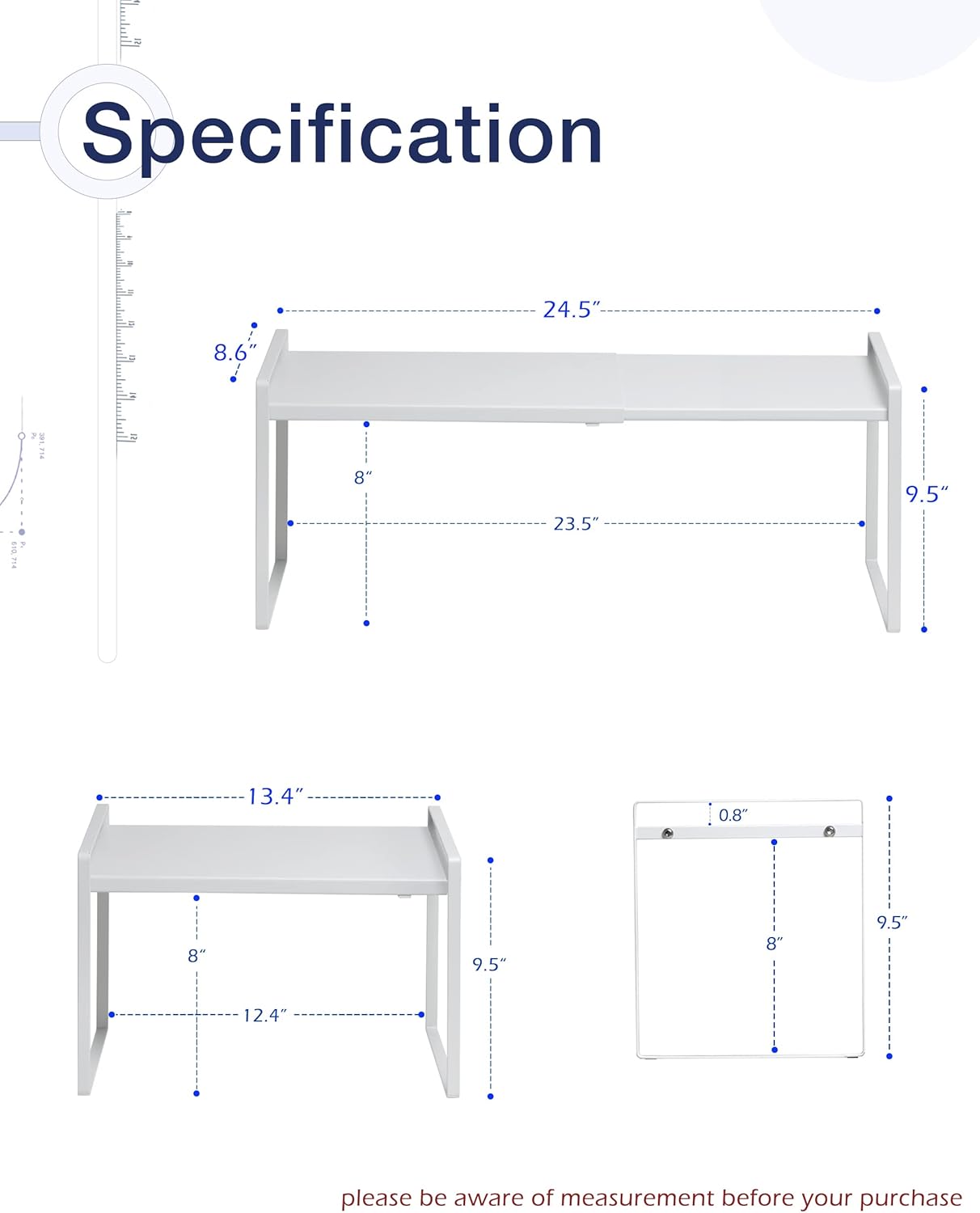 • EXPANDABLE: You may expand the width of this freestanding cabinet shelf to your desires. It can easily vary from 13.4 inches to 24.5 inches in width depending on how you want to organize your space. Specification: 8.6’’D * 13.4-24.5’’W * 9.5’’H