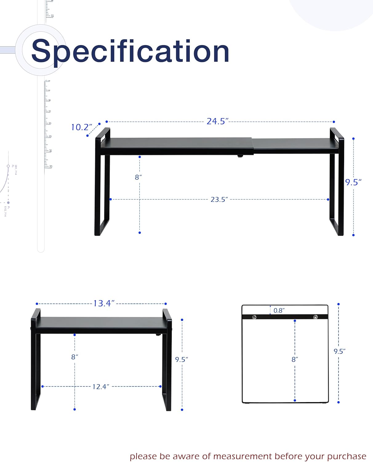 • EXPANDABLE: You may expand the width of this freestanding cabinet shelf to your desires. It can easily vary from 13.4 inches to 24.5 inches in width depending on how you want to organize your space. Specification: 10.3’’D * 13.4-24.5’’W * 9.5’’H