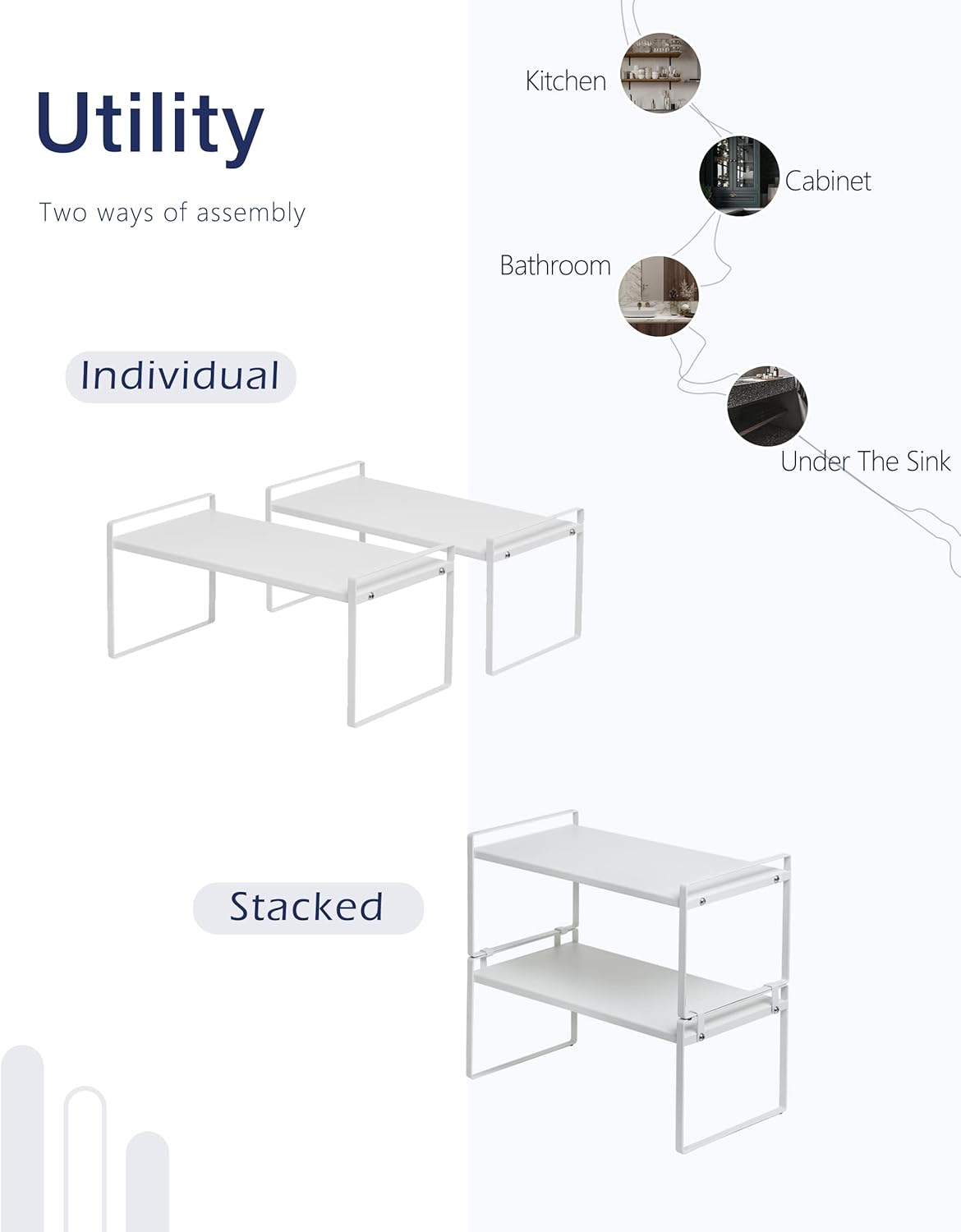 • STACKABLE: The product comes with two sets of cabinet shelves where you can stack one on top of another, creating 2-tiers double space to store household items under, in between or on the shelf. They are perfect to use as storage organizers in kitchen, cabinet, pantry, cupboard, and anywhere in your home or office for that wonderful extra storage space.