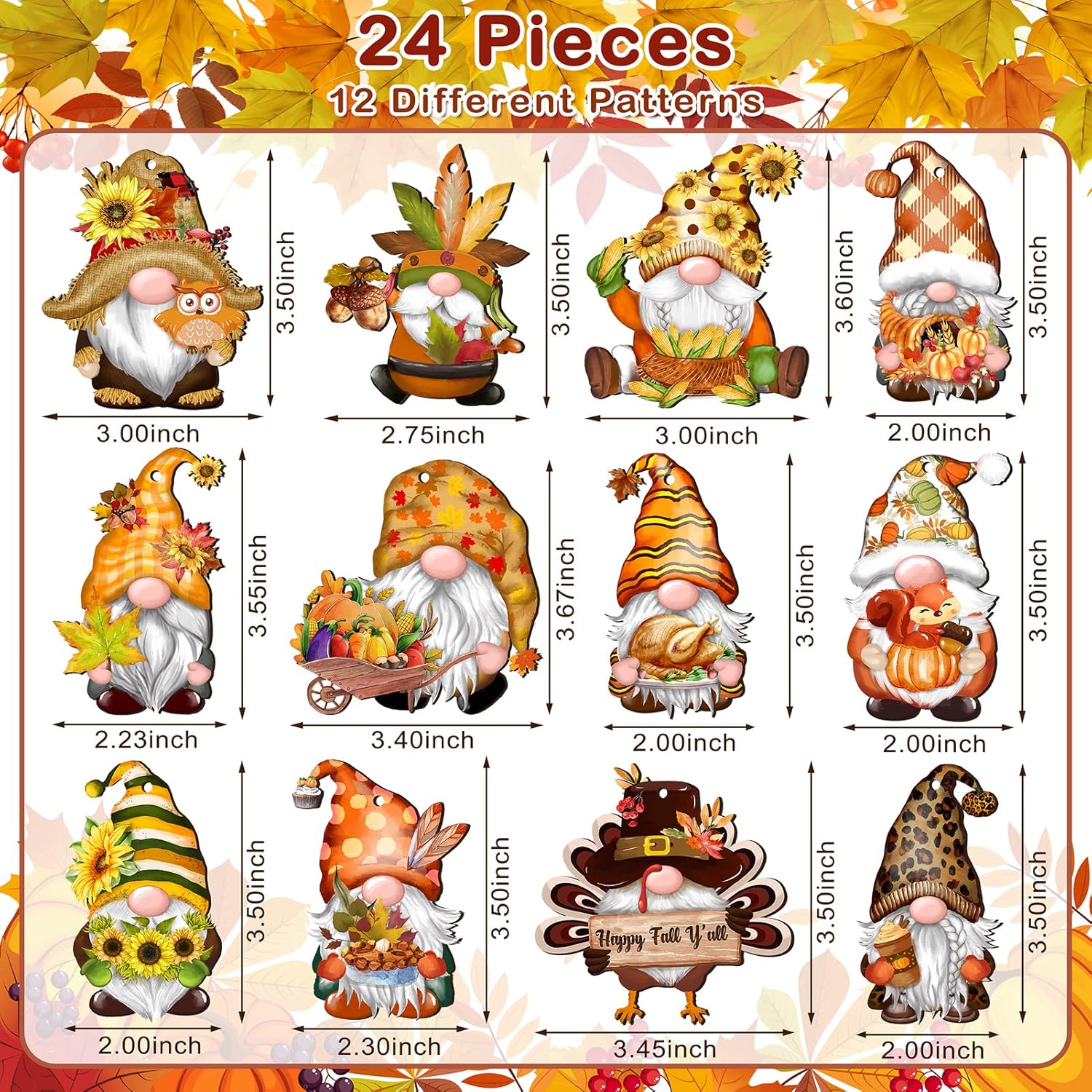 • New Designed Thanksgiving Gnome Wooden Ornaments -- 24 PCS gnome wooden slices with exquisite workmanship in 12 different styles are made of high-quality wood, painting in front and empty at back.