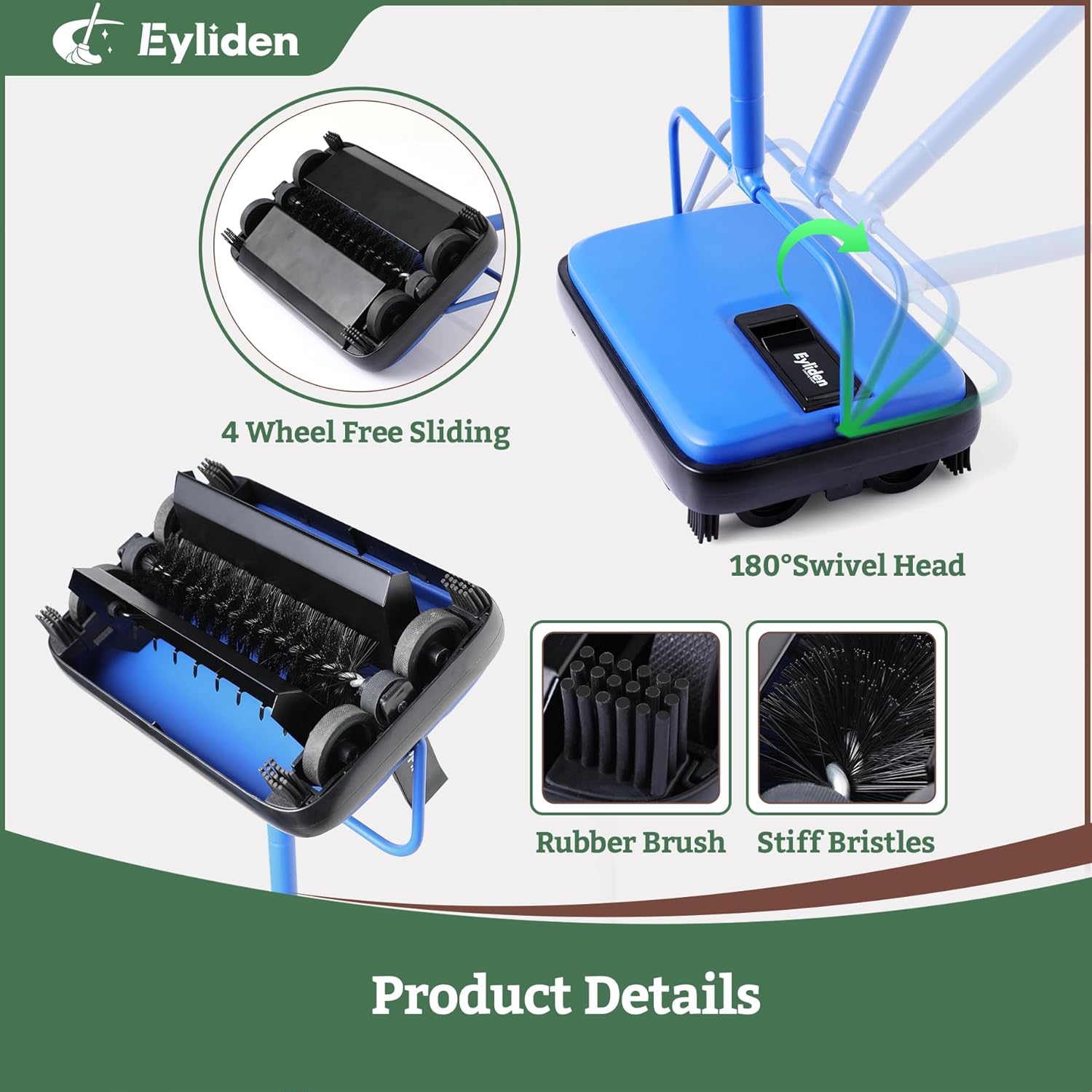 • 【Energy-Saving & Eco-Friendly】NO BATTERIES. Perfect for quick, Eyliden carpet sweeper does not require any electricity or batteries. Easily push back and forth for effective pick up.