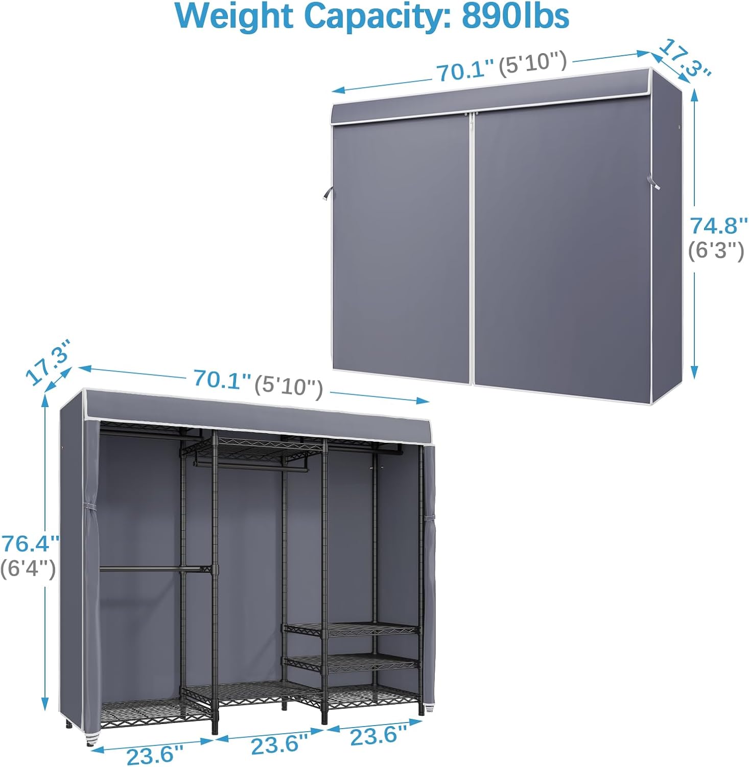 • Dimensions & Load Capacity: 70.1" L x 17.3" W x 76.4" H (includes cover). Load capacity up to 890 lbs. Single hanging rod can support up to 60 lbs, Wire shelf can support up to 88 lbs for each.