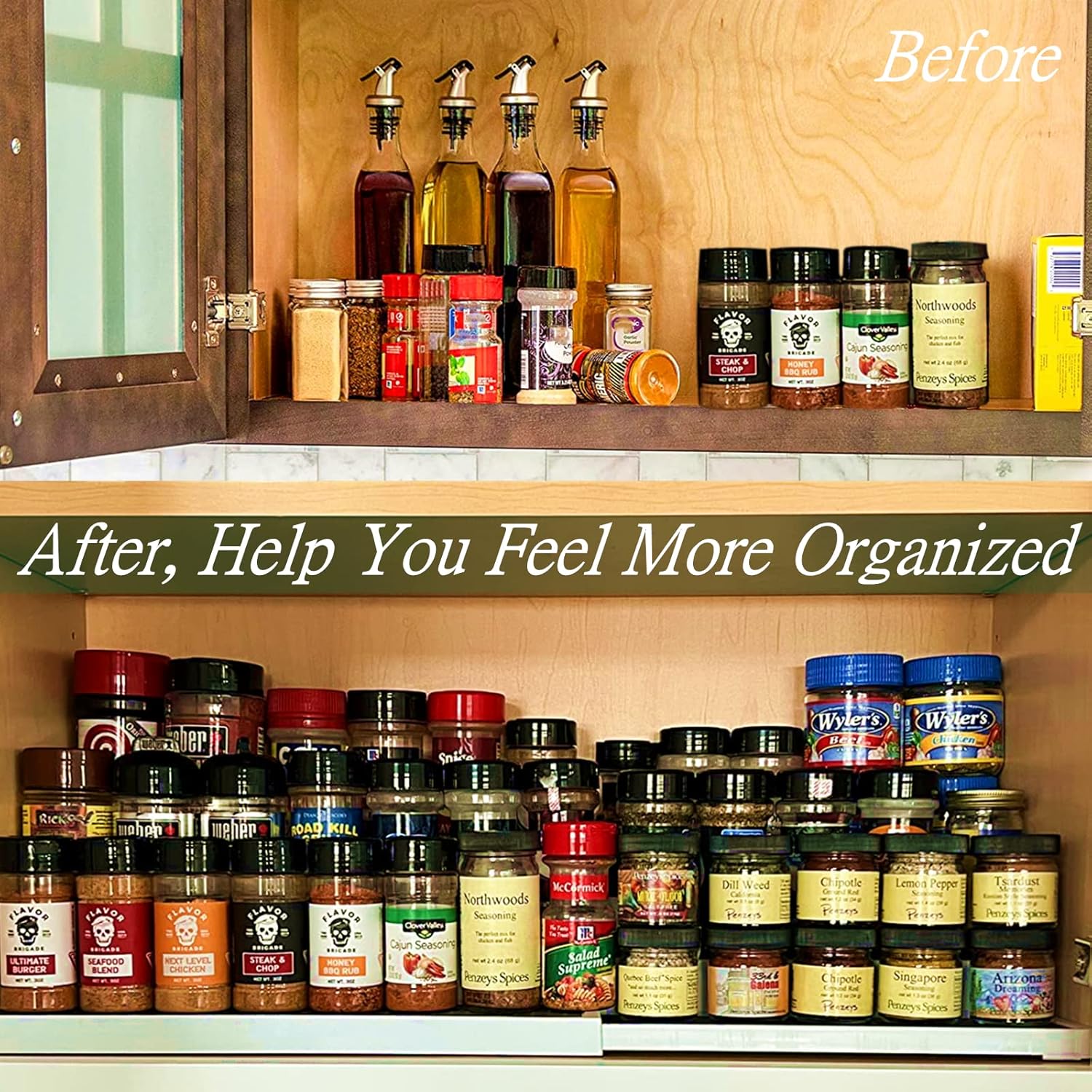 • Stepped Design - Our spice organizer has a stepped design to make it easier to find the herbs and seasonings.his tier spice rack can be used not only to store spices but also to organize and declutter your bedside drawer, your bathroom cabinet, your work desk, and even your other kitchen cabinets.