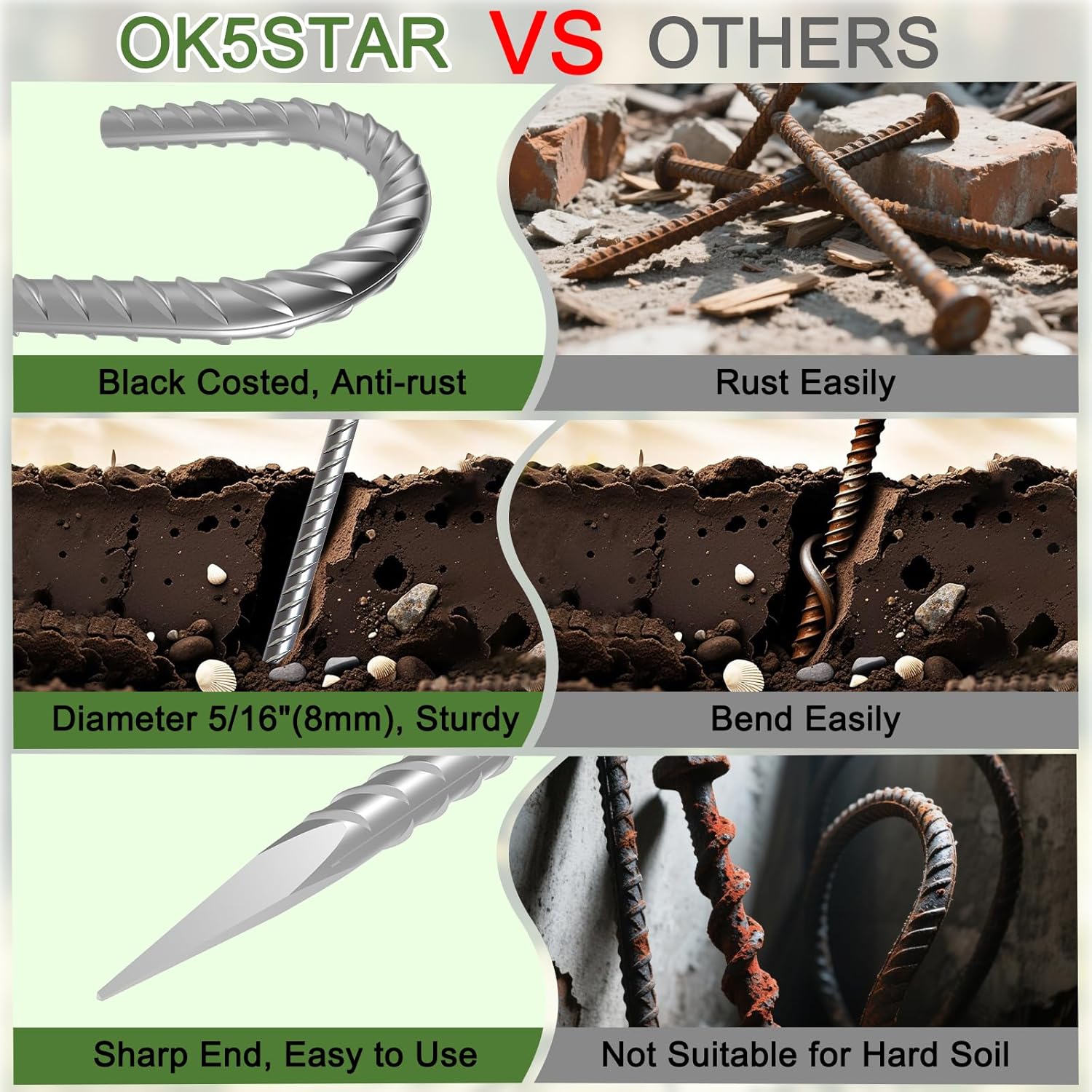 • Strong and Sturdy: Curved rebar stakes are made of heavy duty steel. 3/8"(10mm) Diameter, tent stakes heavy duty is solid all the way, not hollow inside