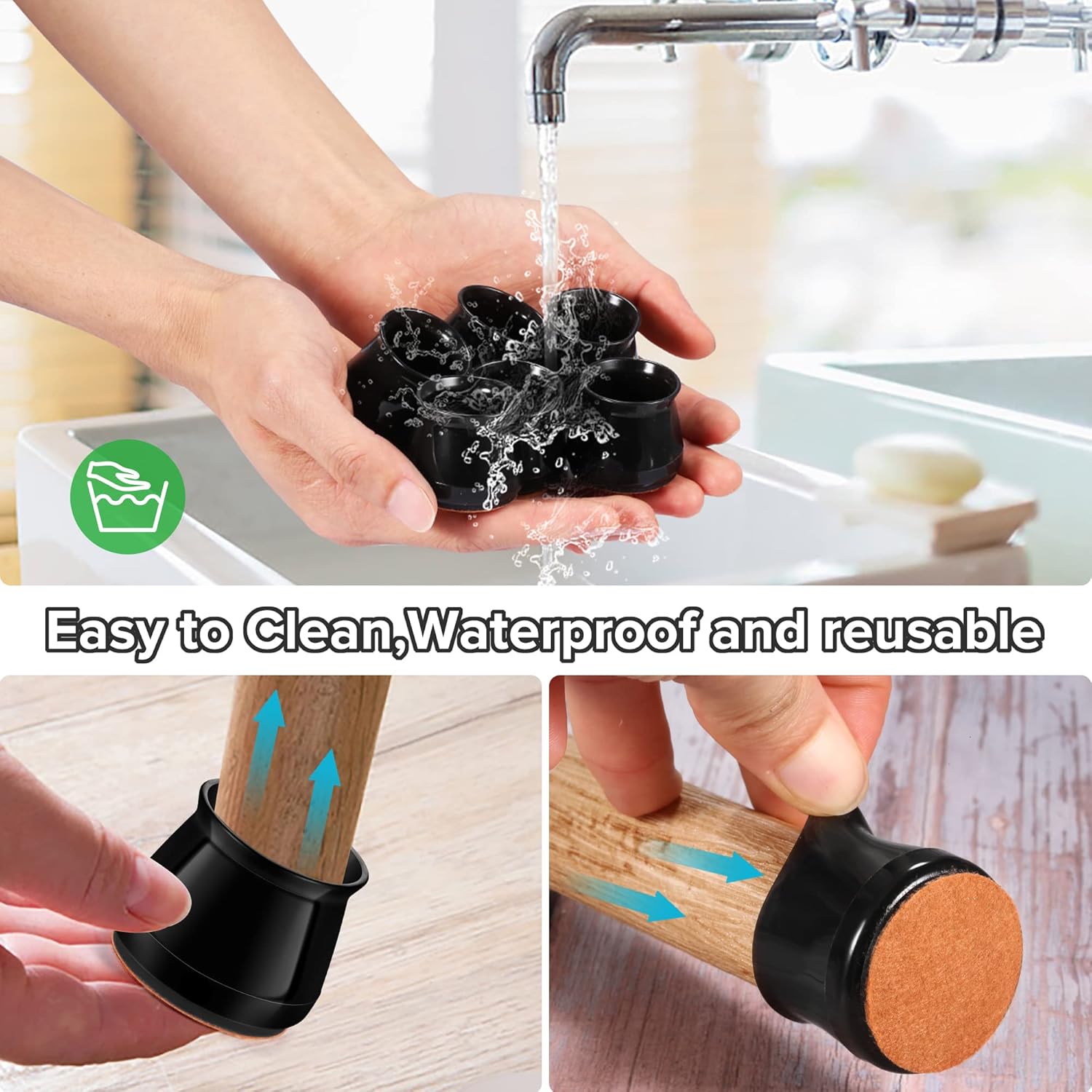 • ✅【Latest Upgrade】Compared with most of the traditional 1mm furniture pads on the market, our silicone chair leg protectors are made of 2mm thick silicone, which will never be damaged, durable. The ruby for chair legs will not change color when stretched. Inside of the inner sleeves are particles with anti-slip, which will firmly fix the chair and never make the covers fall off. Felt pads at the bottom make your furniture move silently and smoothly along floors without leaving marks and noise.