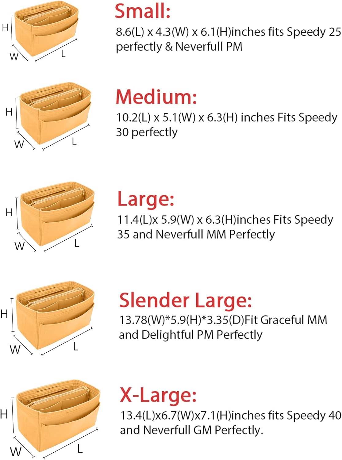 • SIZE OF BAG ORGANIZER: Medium: 9.25(L)*5.9(H)*5.1(W) inch Fits Speedy 30 Perfectly. Slender Medium: 11.2(L)*6.5(H)*3.2(W)inch Fits Graceful PM. Large: 11.4(L)*7.1(H) *5.9(W)inch Fits Speedy 35 and Neverfull MM Perfectly. Slender Large: 13.78(L)*5.9(H)*3.35(W)Fit Graceful MM and Delightful PM Perfectly. X-Large:13.4(L)*7.1(H)*6.7(W)inch fits Speedy 40 and Neverfull GM Perfectly. Portable and Compact Purse Perfectly For any Brand.L*H*W means (Length*Height*Width)