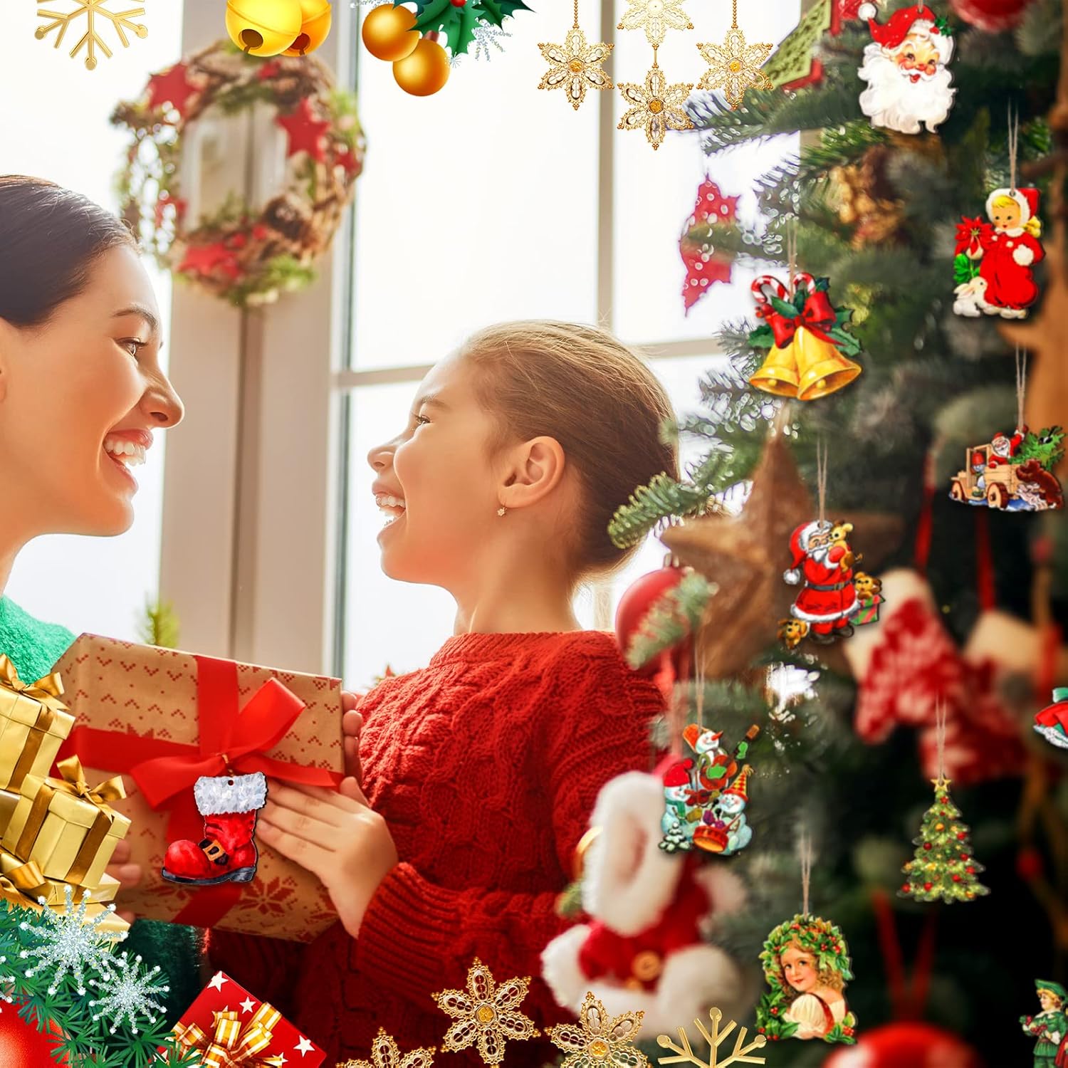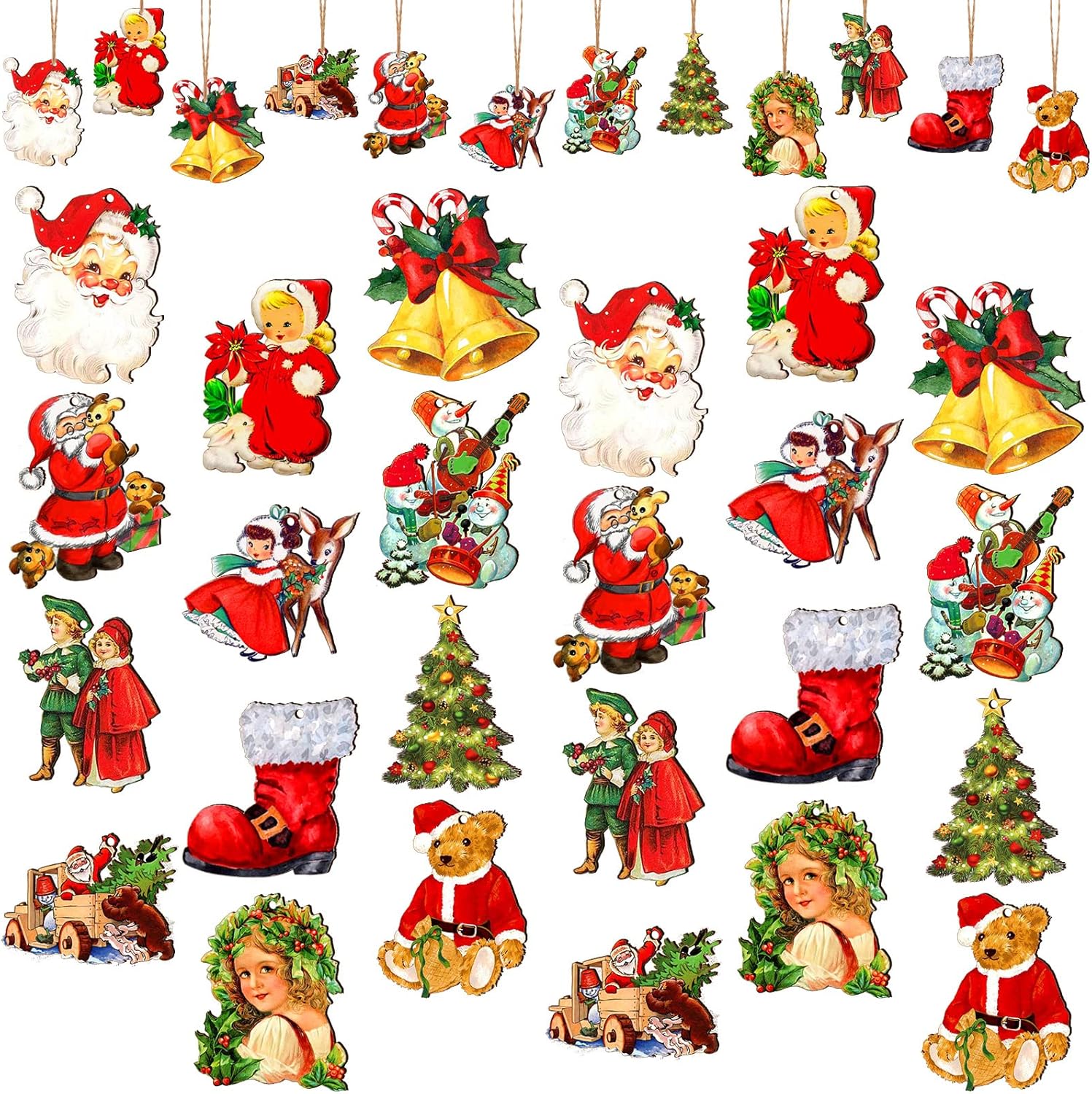 48 Pcs Victorian Style Wood Christmas Tree Ornaments - Hanging Vintage Decorations With Santa Claus and Snowman - Retro Wooden Ornament (Vivid Style)