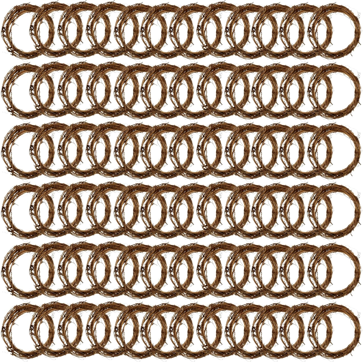 • Natural brown. 3” diameter. Grapevine. 72 wreaths. Natural product; color and size may vary and leaves may be present.