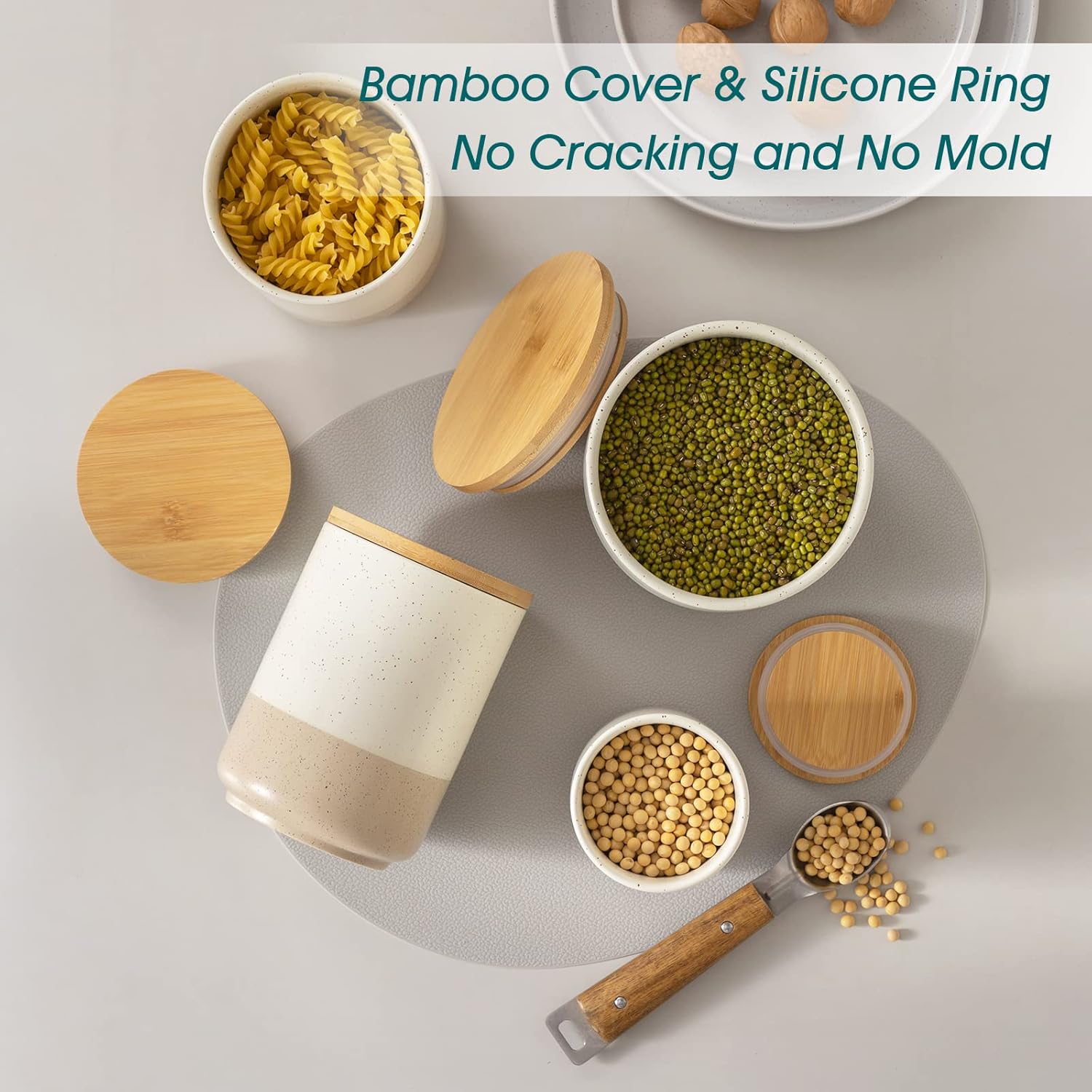 • 【High-quality Material】The canisters are made of high-quality terracotta, which is not easy to crack, and is more durable than plastic and glass. The lid is made of wood, with sealing rubber ring to improve the sealing. Effectively keep the items dry and fresh.