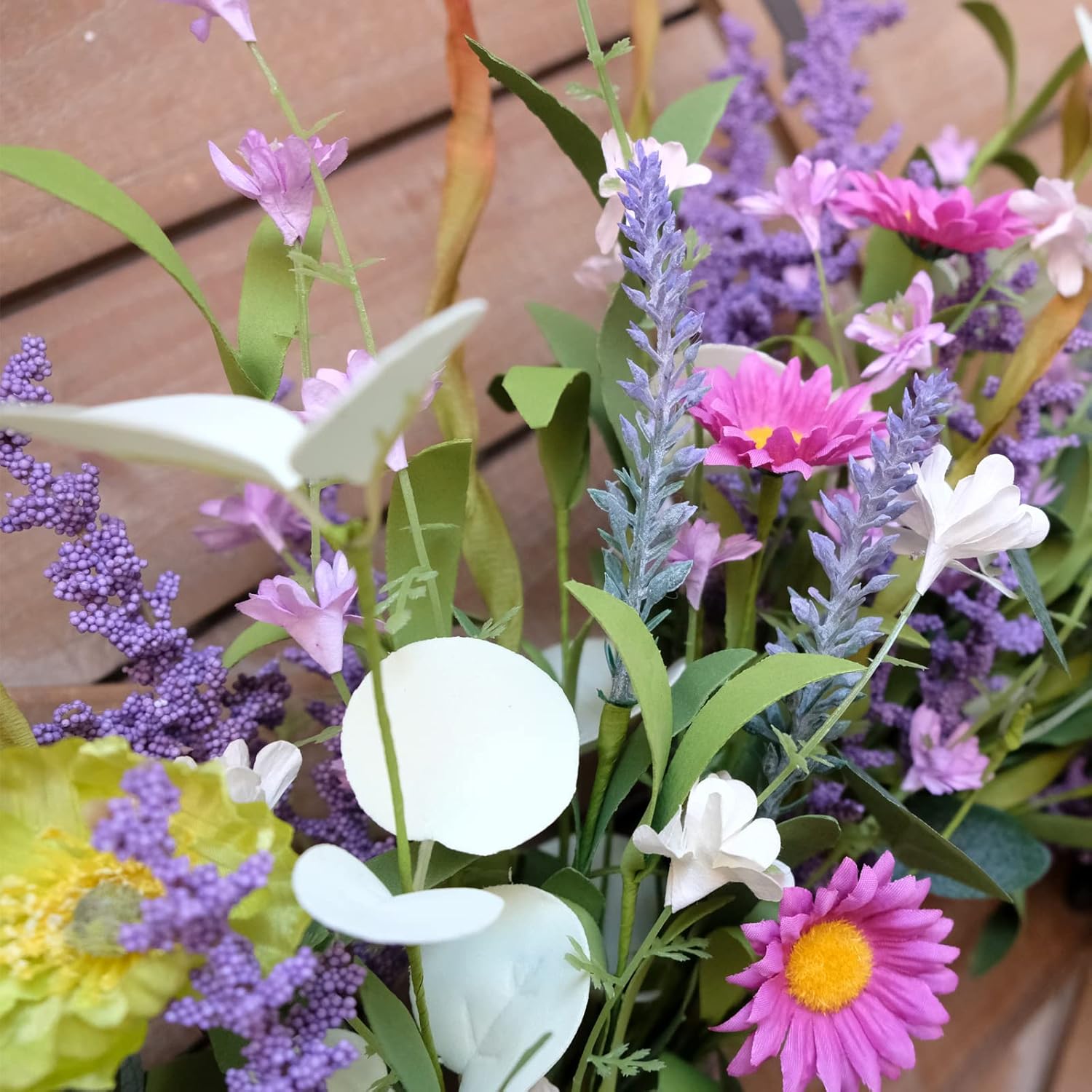 • [Spring Artificial Flower Front Door Wreath] More than three kind of different green leaves match four kinds of different spring fresh and life looking wild flowers. This front door wreath will give your door much more energy and vigor. Good choice for Spring decor.