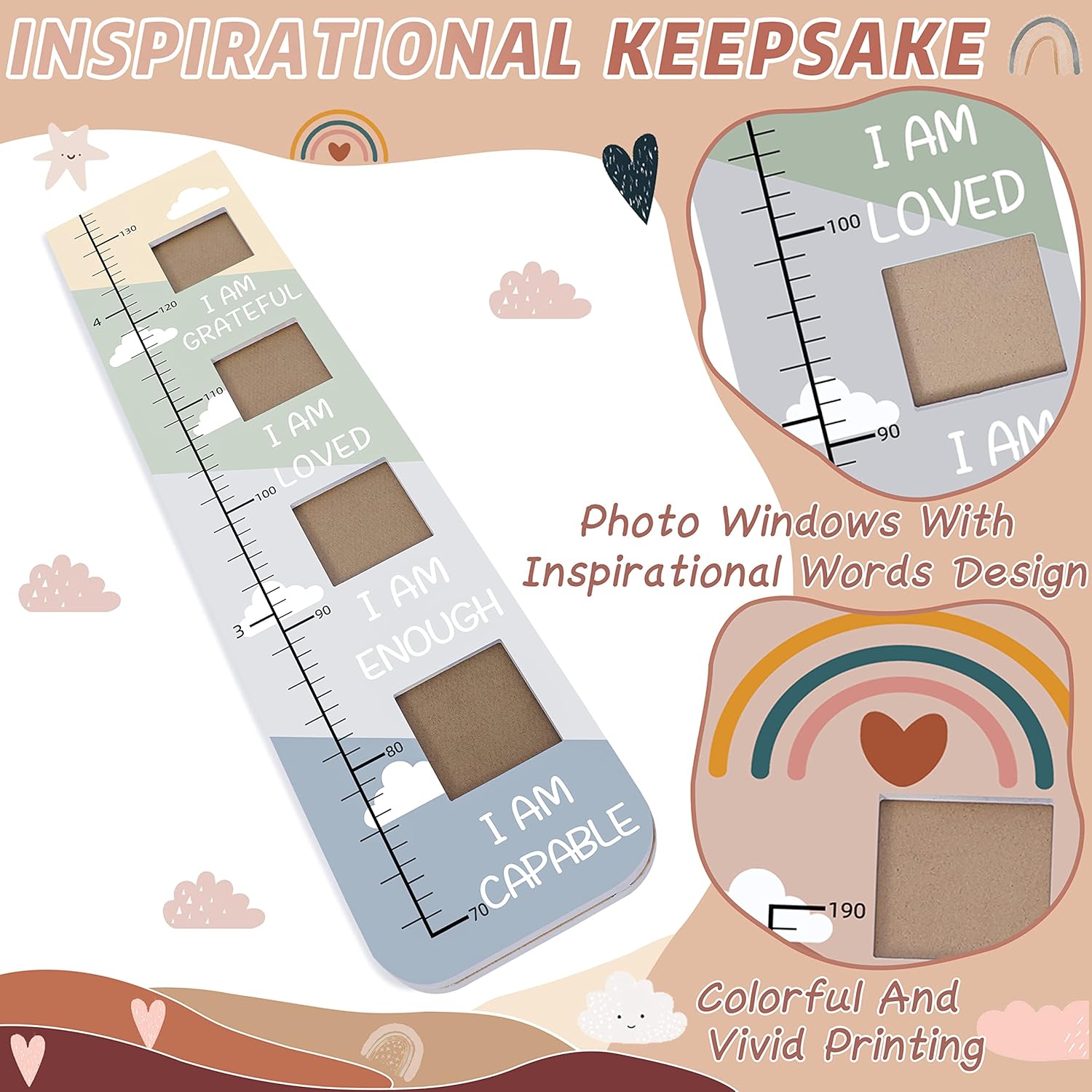 • ❤️【Durable & Safe】Our height chart for wall is smoothly polished edges and has rounded corners that won't scratch children. The ink is safe and non-toxic, adopting UV printing, which will make the rainbow pattern & positive sayings vivid and not easy to fade. Each piece of hardware is sturdy and can hold the photos stably. Such aesthetic artwork will accompany your family for years.