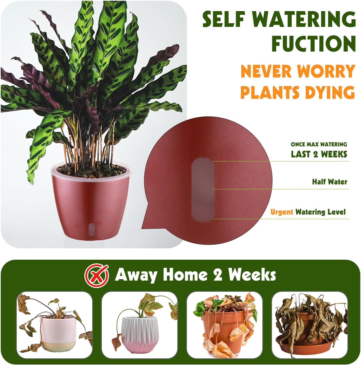 • Self Watering Pots with Indicator: Tired of constant watering? These self-watering pots feature a built-in cotton wick that draws water up to the roots as needed, keeping your plants perfectly hydrated without daily attention. The clear water level indicator ensures you never overwater or underwater again!