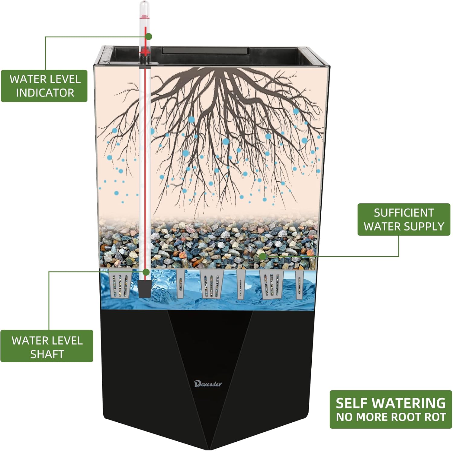• SELF WATERING & NO MORE ROOT ROT - The smart unique sub-irrigation system is one of the most appealing aspects among all Dexceder planters. The easy-to-use separated integrated water reservoir or catcher- keeps your soil well aerated and automatic supplies plants with the right amount of ongoing moist air & nutrition for optimal growth. The insert indicator shows you the exact time to water again. The full water supply period can single-handedly last over 1 month based on different live plants
