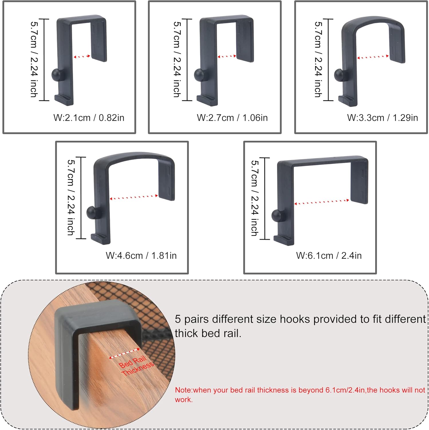 • Durable and Roomy Storage Basket : The basket is made of reinforced and high density iron wire mesh around with well welded strong iron wire,surface finished with glossy painting.Basket appro size:10.43"x4.72"x3.62"(LxWxH).5 pairs different size plastic hooks offered to fit different thick bed rails,Thickness of bed rail the hooks can fitted are:2.1cm/0.82",2.7cm/1.06",3.3cm/1.29",4.6cm/1.81",6.1cm/2.4".(Note:If the thickness of your bed rail is beyond 6.1cm/2.4",all the hooks won't work for it)