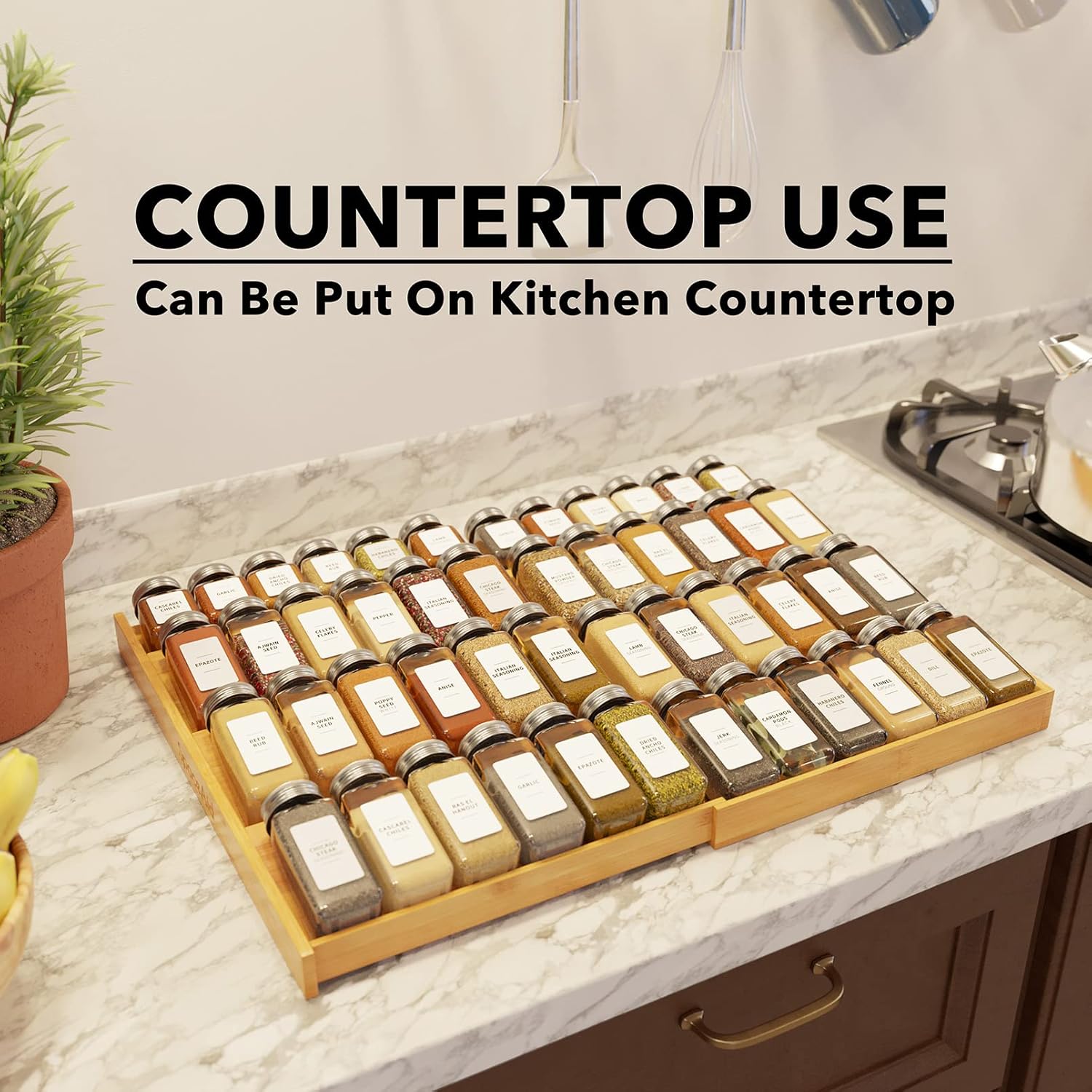 • STURDY CONSTRUCTION - The drawer spice rack is made of durable solid bamboo; Live an organized and sustainable life with this bamboo seasoning drawer organizer