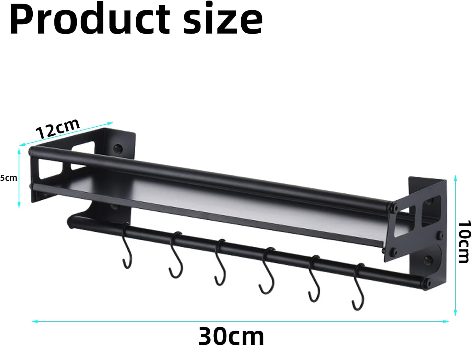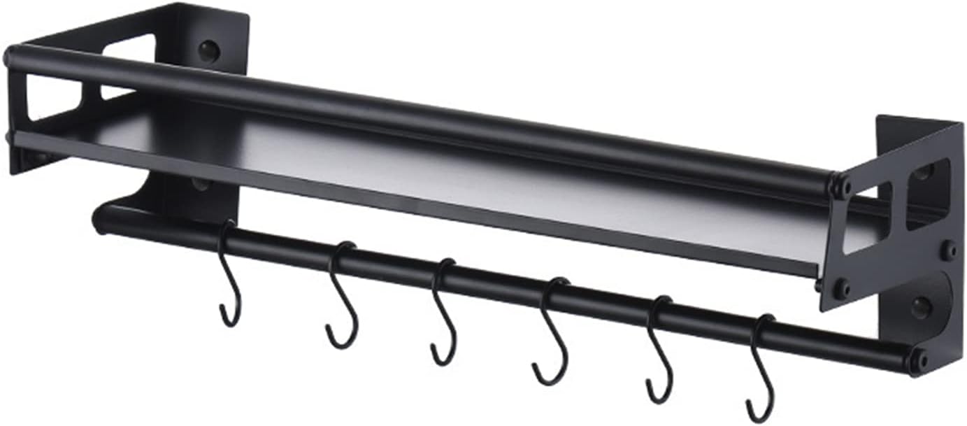 Wall Mount Storage Holder,Stainless Steel Strong Shelf with 6 Removable Hooks, Spice Rack Organizer,Kitchen Organizer Shelf, Space Saving Spice Rack and Kitchen Storage (black)