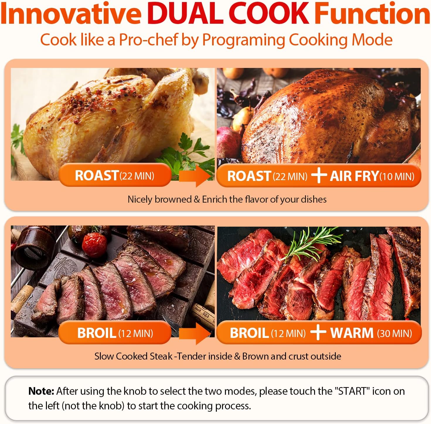 • 【Fast & Even cooking, Less-oil, Crispy】The convection fan of air fryer generate 360°hot airflow produces crispier exterior and moist tender interior with less oil,providing you with perfect taste and healthy diet. The innovative dual cook function enables you to combine any two functions in preset. Make Complex recipes effortless and rich the dish's flavor.Double Glass door heat insulation reduces heat loss effectively reduces preheat time.