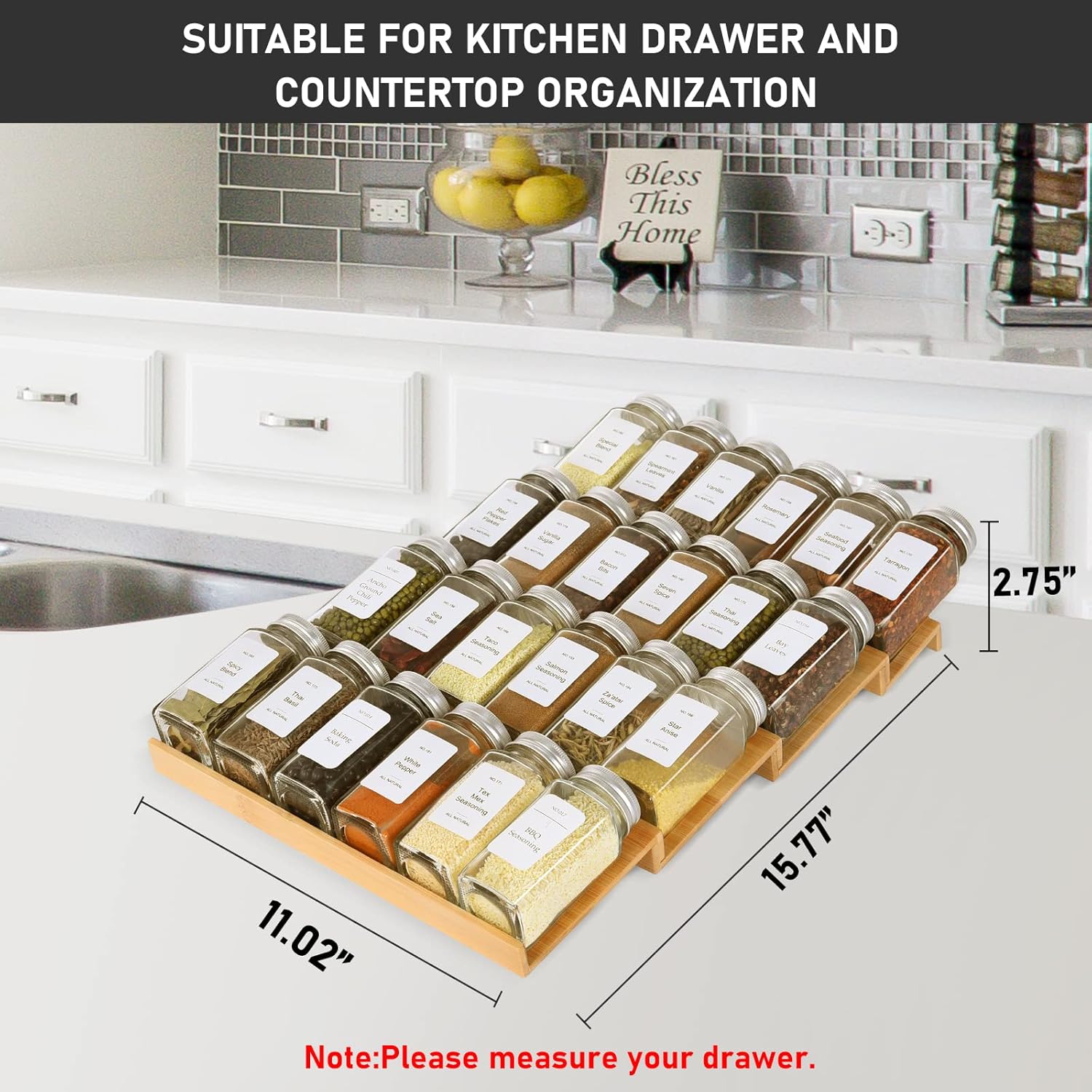 • Large-Capacity 4 Tire Spice Rack: Measures 11.02"×15.77"×2.75"(with jars), KitHero spice drawer organizer is applicable to most drawers, and the inclined board design makes it quick and easy to read the labels and grab jars.The hand-polished high quality construction 5 mm trays are sturdy and smooth, easy wipe to clean.Note:please measure your drawer!