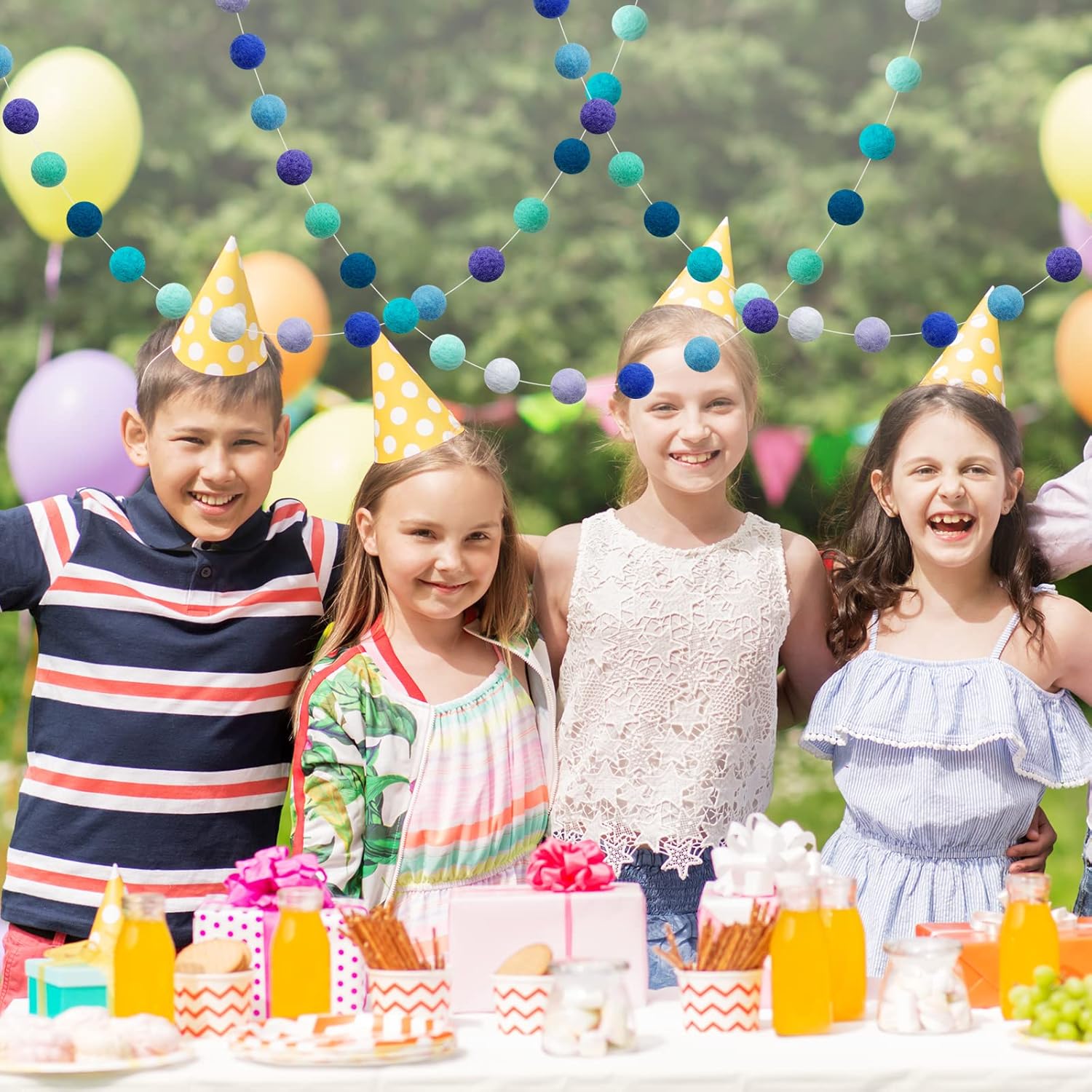 • Pom Pom Garland: This garland is made with 20mm felt balls. 36 balls are hand-stitched to the string. ▶▶Balls are NOT in fixed position in the garland.