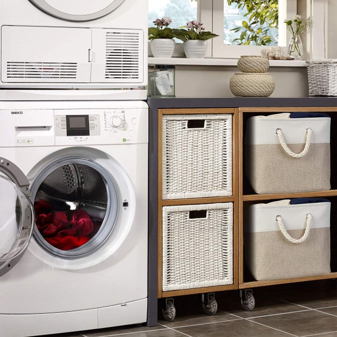 • Canvas basket storage bins are constructed of fabric with a sturdy base and thick rope handles for easy to carry or pull off and out of shelves. These storage baskets are tough enough to hold whatever you throw in it