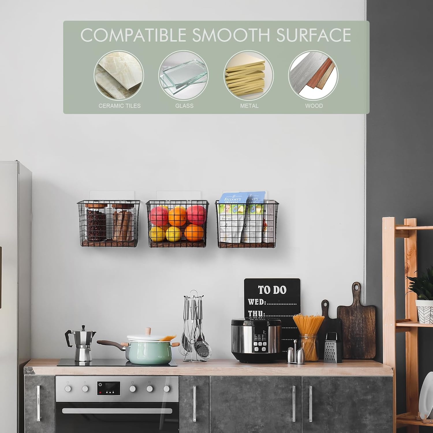• Flexible Installation - 2 wall mount solutions. Come with adhesive stickers and a screw hook set. The non-trace stickers for holding things below 22 lbs in baskets work with any smooth and clean texture like glass, ceramic, or cabinet. Metal hook screws are available for needs over 44 lbs.