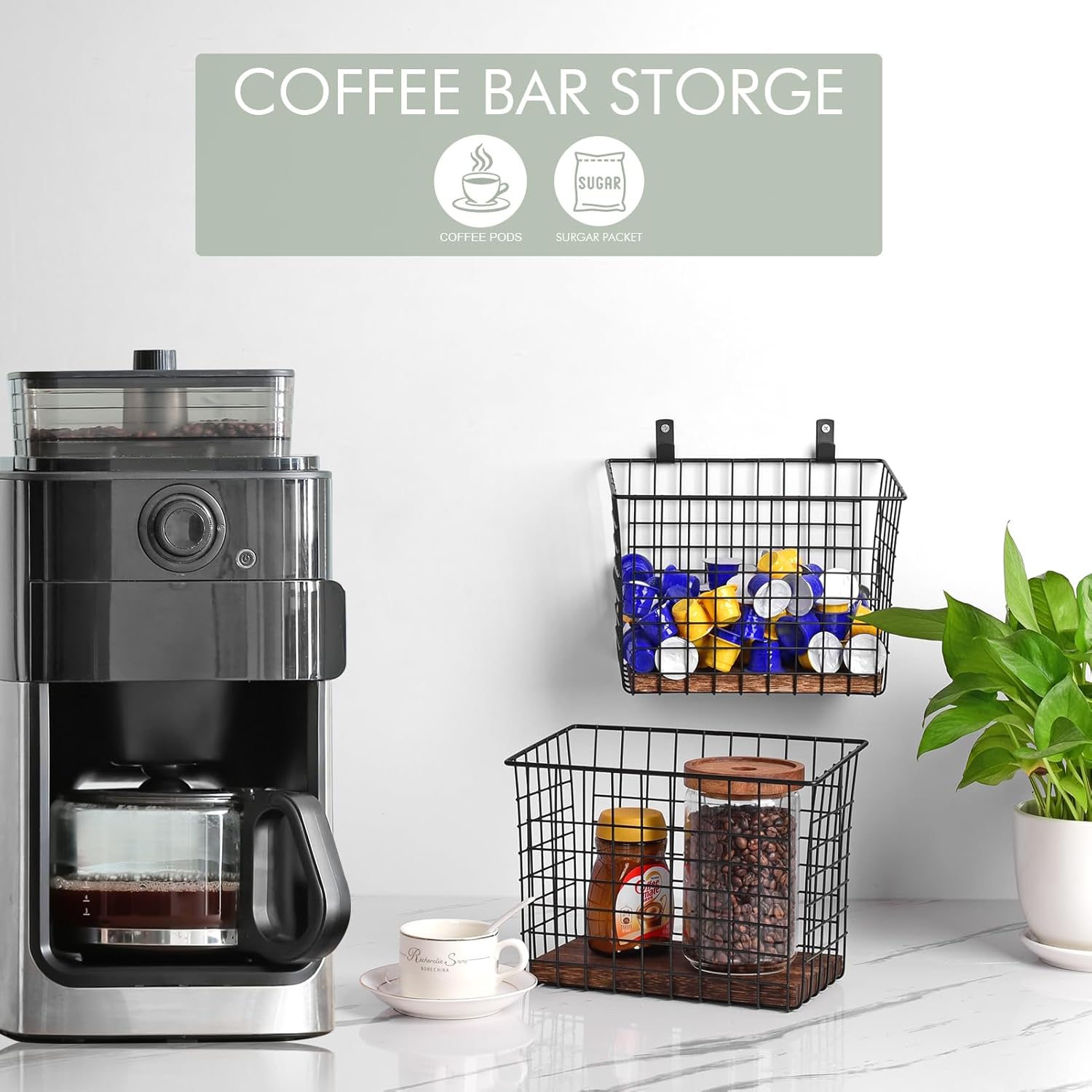 • Large Storage Holders - 9.9" x 5.9" x 7.4" (D x W x H) for each wire basket, with sturdy iron hanging hooks. The shallow-fronted top allows for easier access to items stored inside. Great to keep a wide range of items.