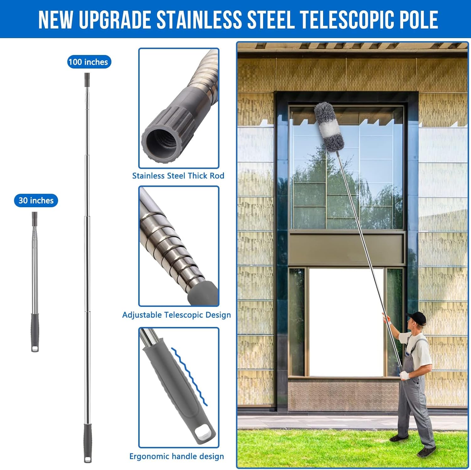 • ERGONOMICALLY LONG TELESCOPING DUSTER: The telescopic duster with a stainless steel handle extends from 30 to 100 inches, providing a sturdy, comfortable grip Reach difficult corners and gaps without climbing ladders