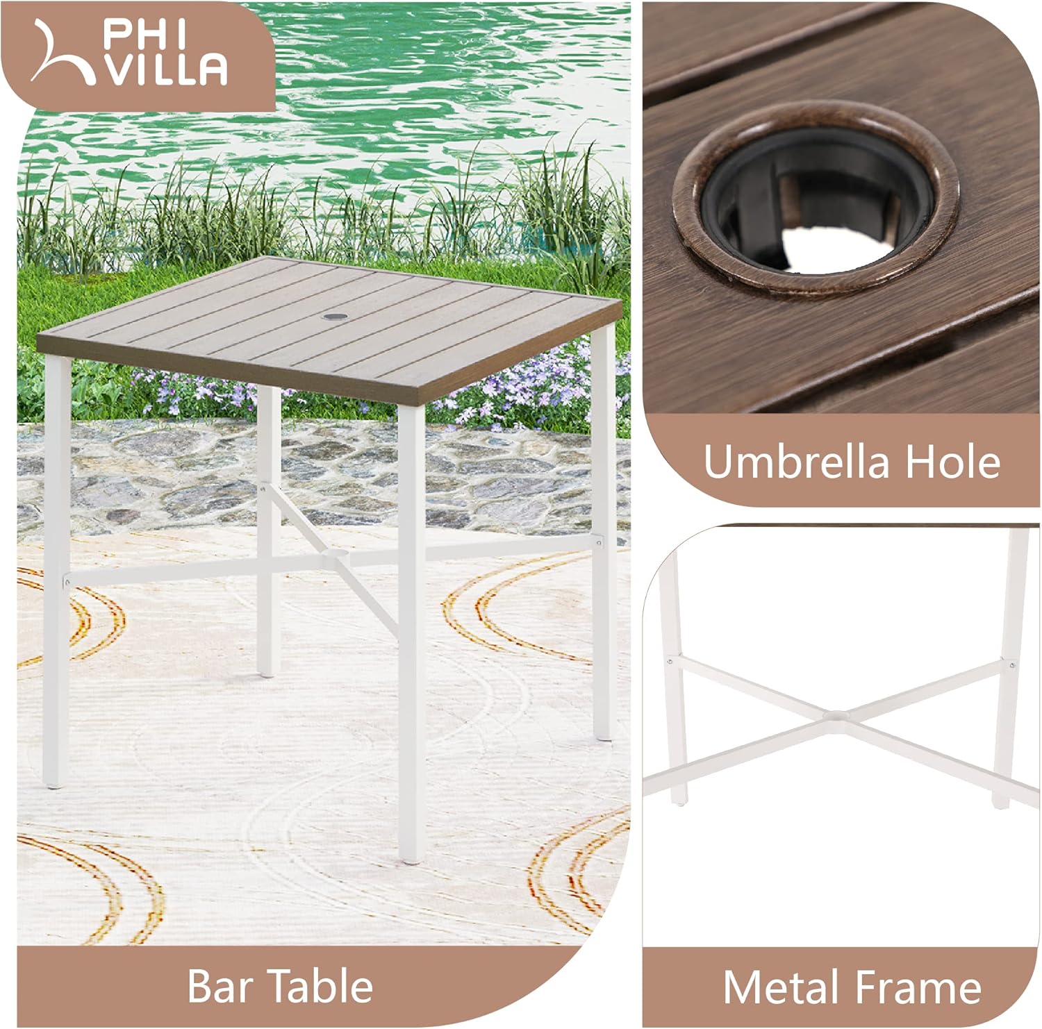PHI VILLA Outdoor Bar Table, High Patio Table with Umbrella Hole, White Legs, Metal Frame, Sturdy & Durable for Outdoor & Indoor