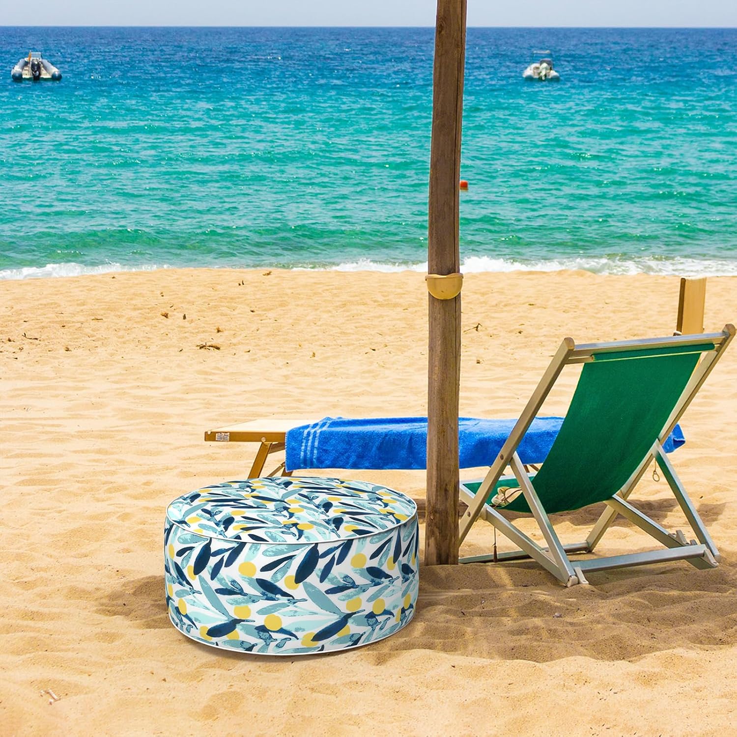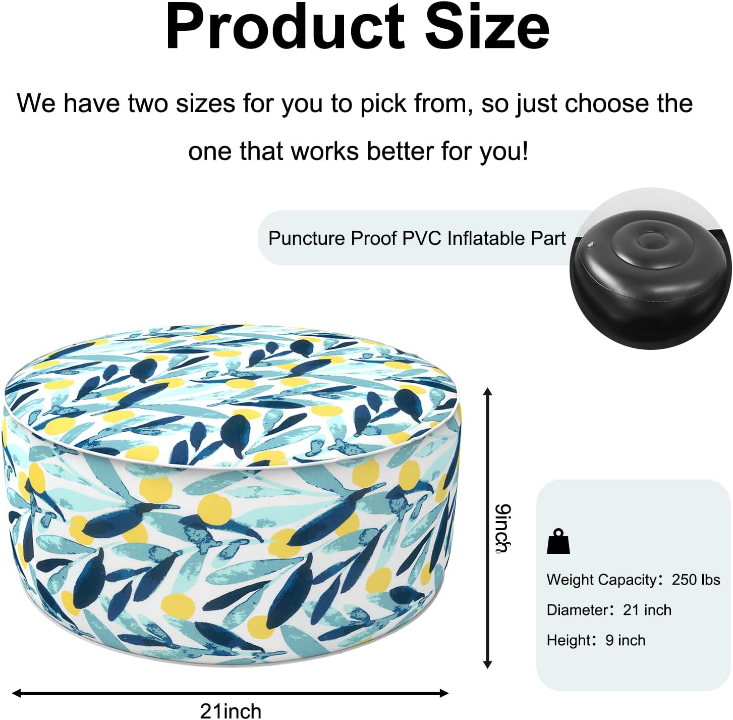 Inflatable Ottoman Stool D21 xH9 for Outdoor/Indoor Use, Water Repellent Patio Foot Rest Stool with Portable Handle,Round Pouf Ottoman Suitable for Garden,Deck and Camping - Leaves Multi