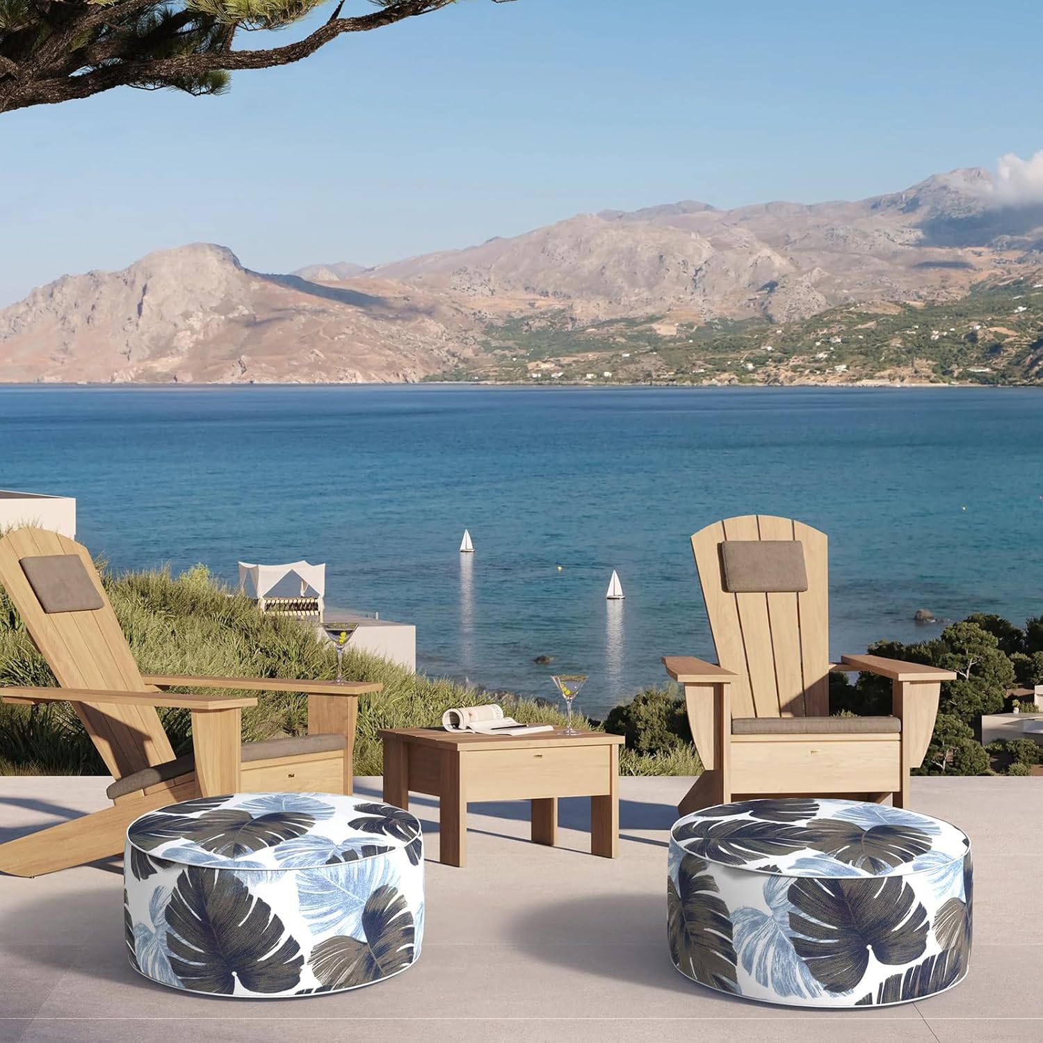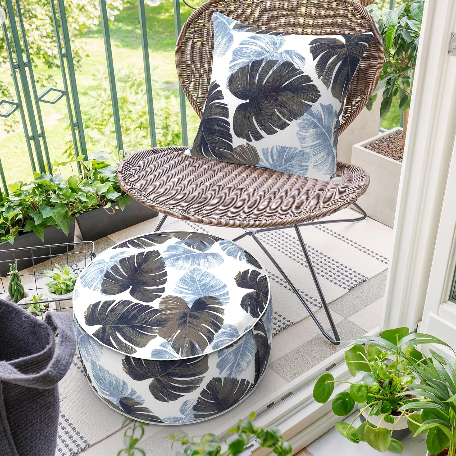 Inflatable Ottoman Stool D21 xH9 for Outdoor/Indoor Use, Water Repellent Patio Foot Rest Stool with Portable Handle,Round Pouf Ottoman Suitable for Garden,Deck and Camping - Monstera Blue