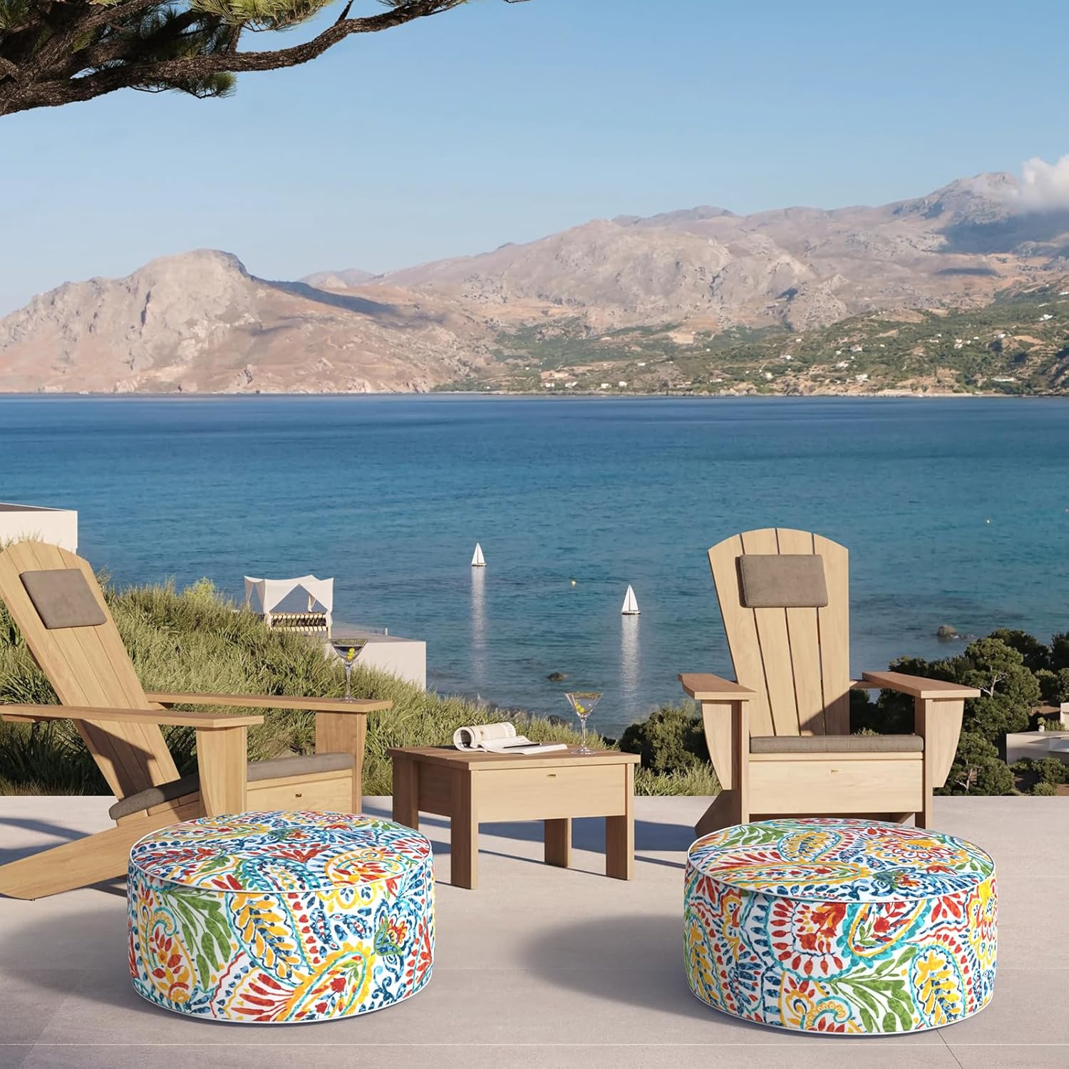 Inflatable Ottoman Stool D21 xH9 for Outdoor/Indoor Use, Water Repellent Patio Foot Rest Stool with Portable Handle,Round Pouf Ottoman Suitable for Garden,Deck and Camping - Paisley Multi