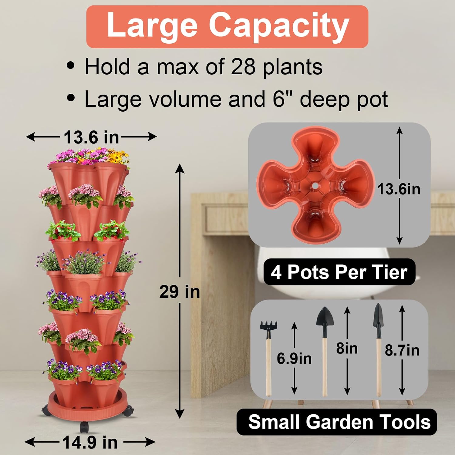 • SOIL HOLDING BOARD - Each tier has a board that holds soil while allowing water to drain down.