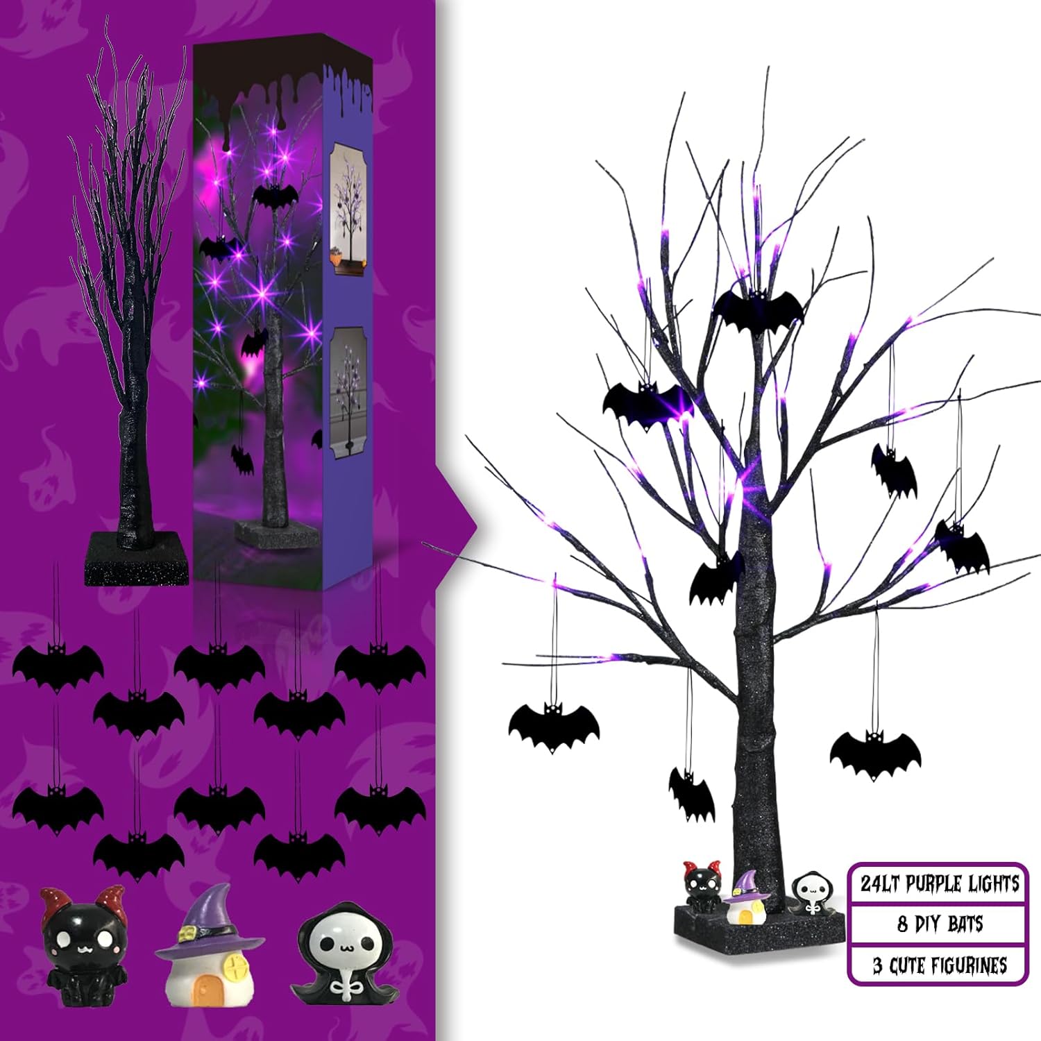 • Lighted Halloween Decor: Light up 24" black twig tree with beautiful spooky purple lights. The superposition of bats and purple lights gives a ghostly effect. Perfect as decorations for room, table, fireplace, window sill, dining table