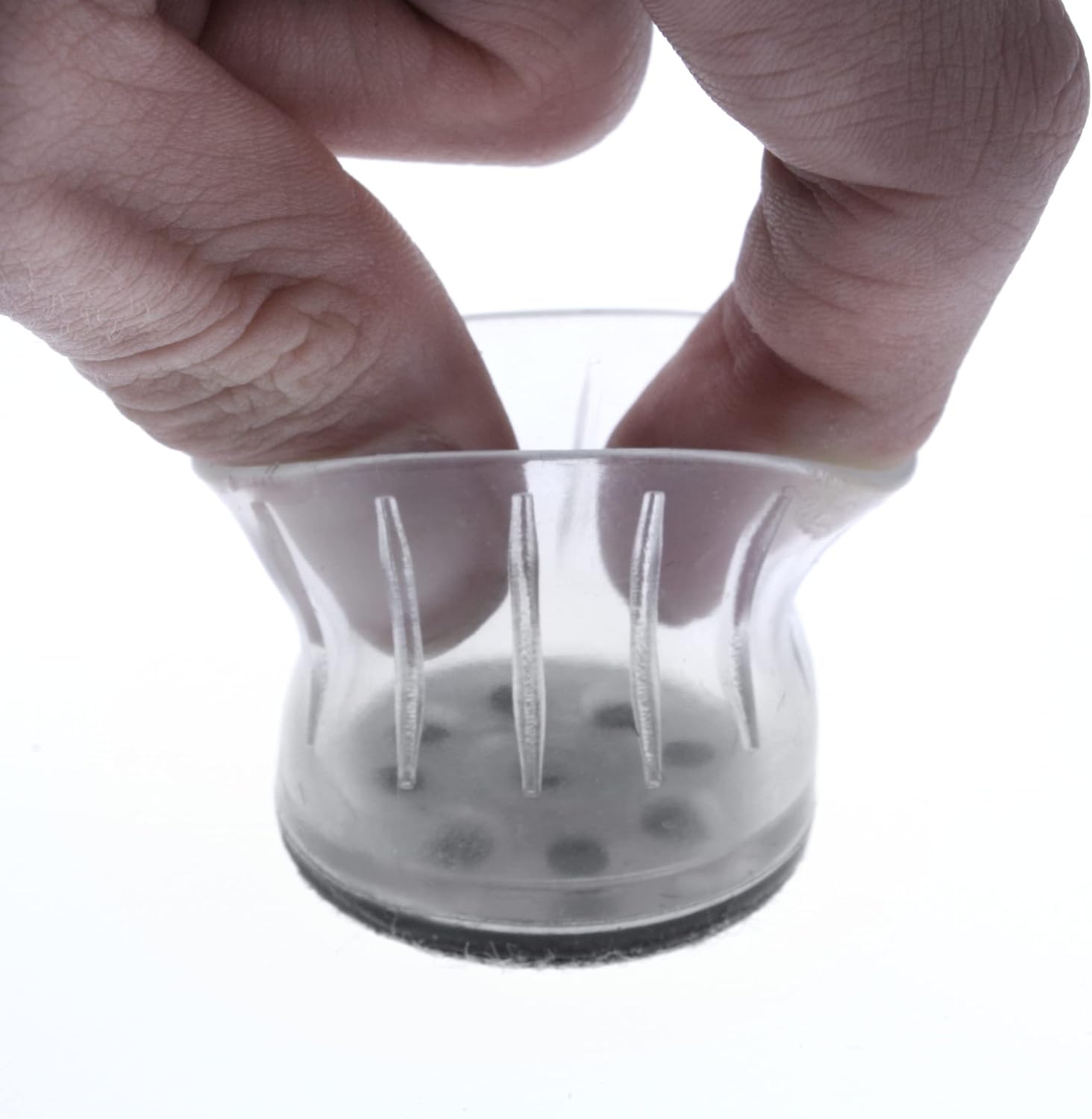 • Fits square and round furniture legs – These stretch to fit chair pads securely fit round legs 1-3/16” to 1-3/8” in diameter (30 – 35mm) and square legs 1-1/8” to 1-5/16” in diameter (28 – 33mm). The tube that holds the furniture leg is made of an advanced polymer material that is strong, tear resistant, long lasting, and clear for low visability.