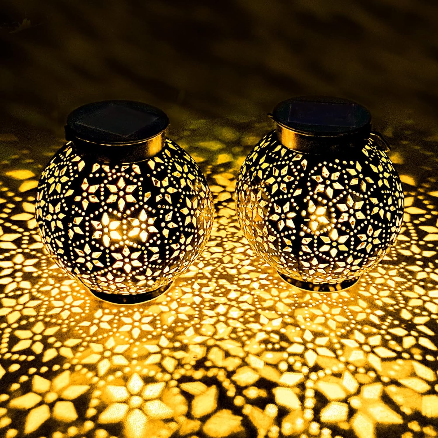 2 Pack Outdoor Solar Lantern Lights, Waterproof Tabletop LED Moroccan Lanterns, Hanging Metal Decorative Garden Lights for Patio, Lawn, Porch, Backyard
