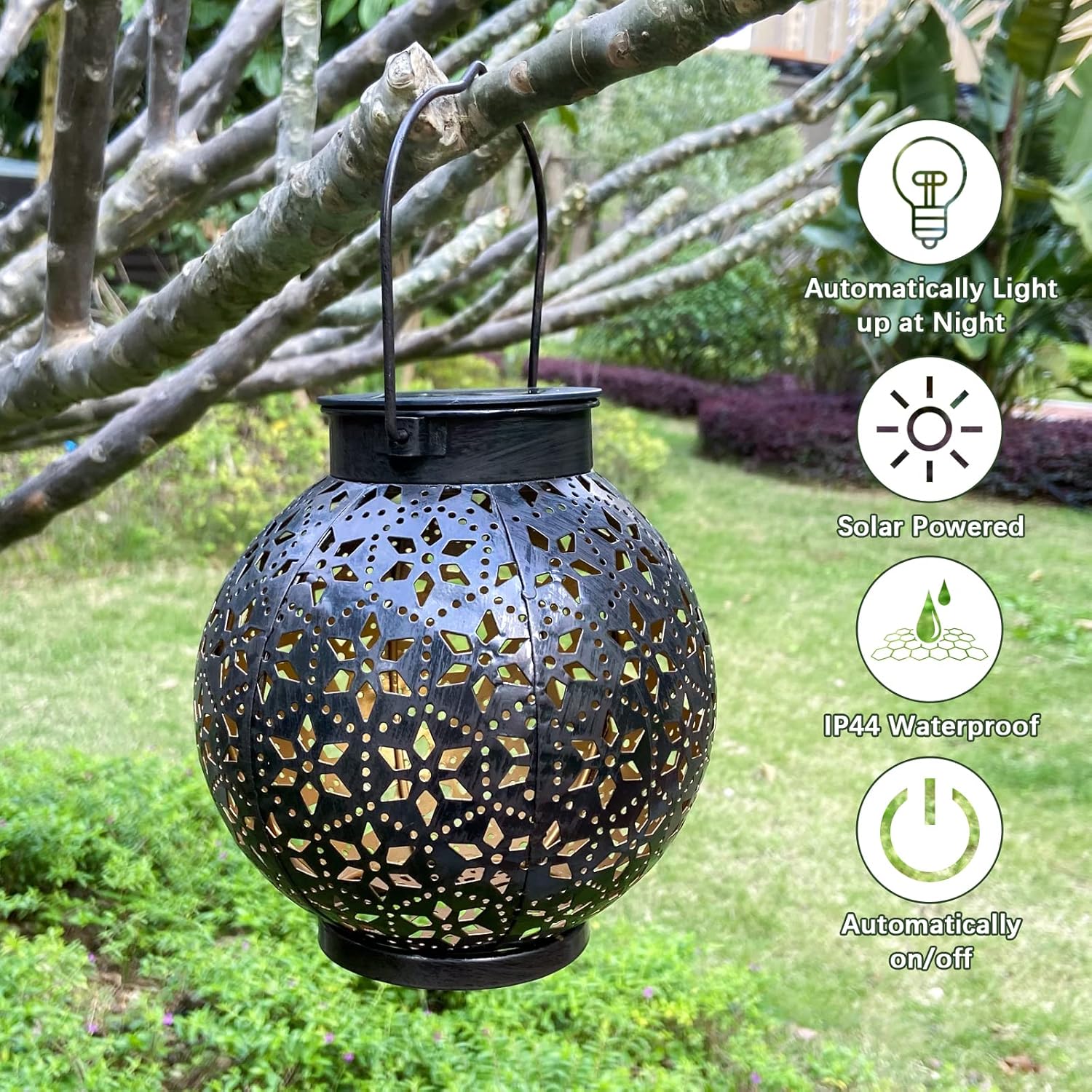 • Dusk to Dawn Auto ON/OFF: During the day, the solar panel converts sunlight into electricity and recharge the battery. At night, the solar lanterns turn on automatically from the electricity stored during the day.Bright LED lights last for at least 8 hours at night.