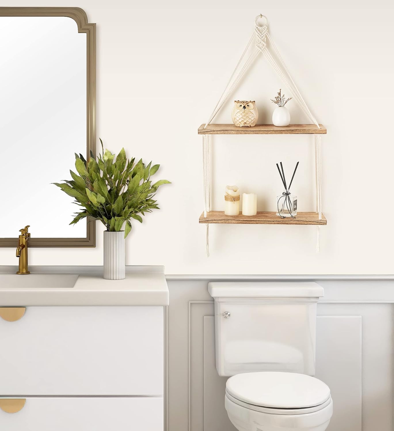 Mkono Macrame Hanging Shelf Boho Wall Decor 2 Tier Handmade Cotton Rope Rustic Wood Floating Shelves Display Photos Plants Hanging Storage Shelving for Living Room Nursery Bathroom Bedroom