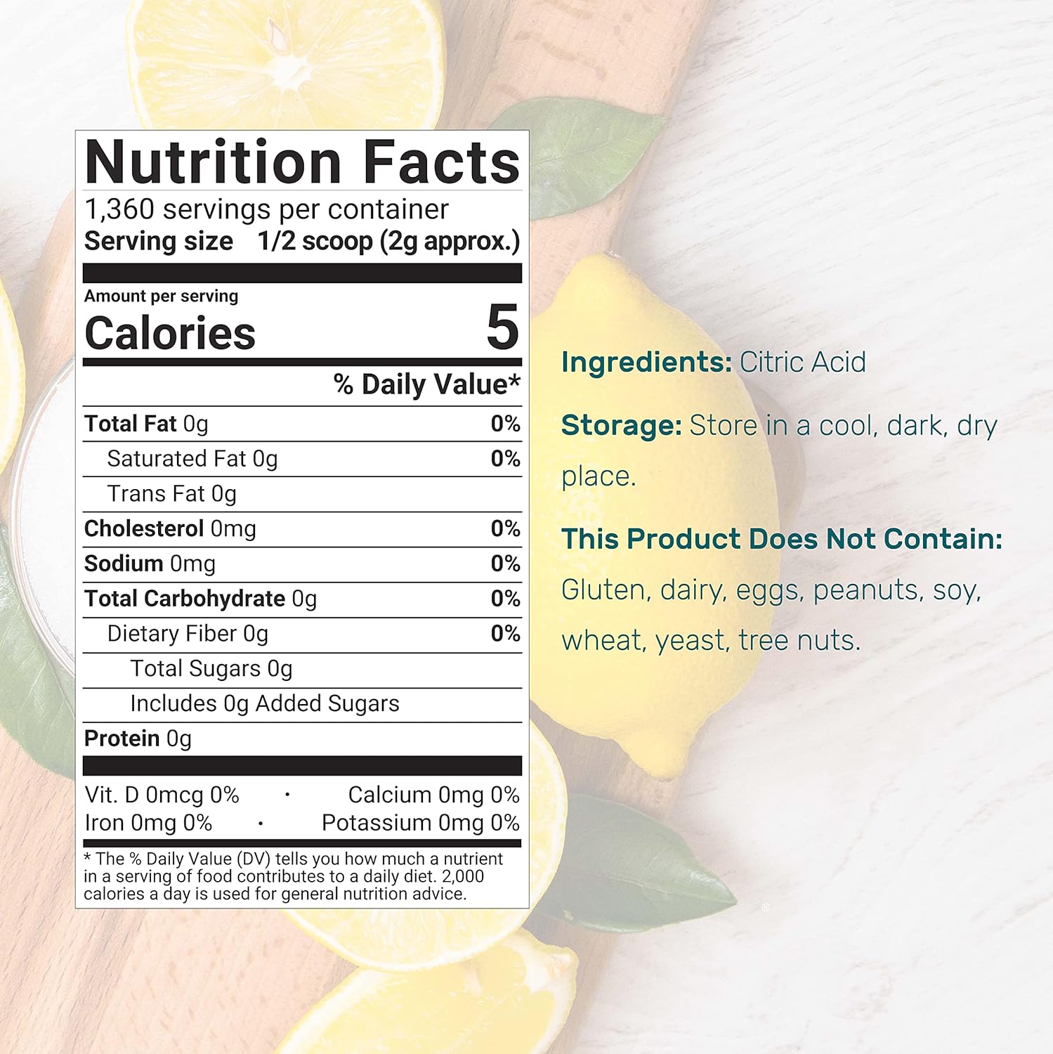 • Dosage & Servings: With only ½ a scoop needed per serving, the 6-pound pouch provides an impressive 1,360-day supply, making it an excellent long-term solution for all your citric acid needs.