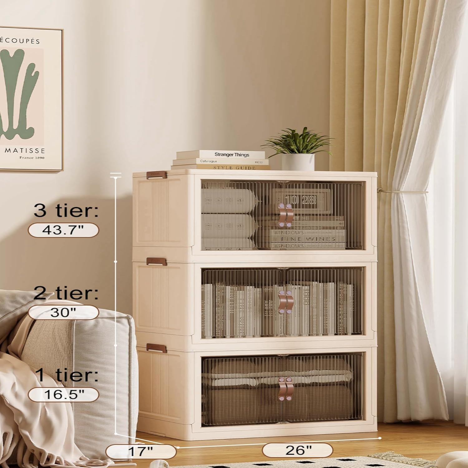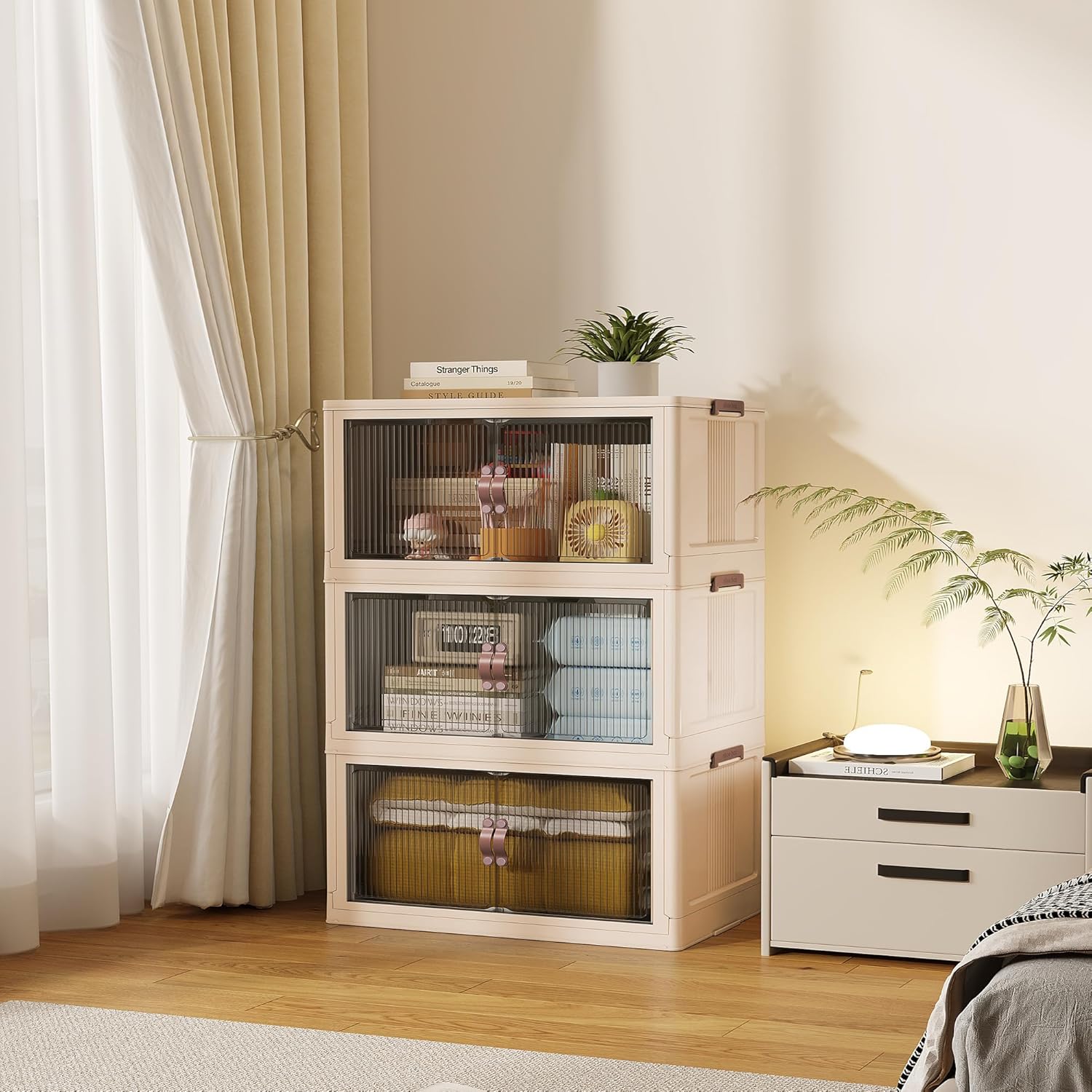 SAILUN 83Gal/335Qt Stackable Storage Bins Folding Collapsible Storage Bins with Lid, Closet Organizers and Box with Door Beige 26" W x 17" D x 43.7" H