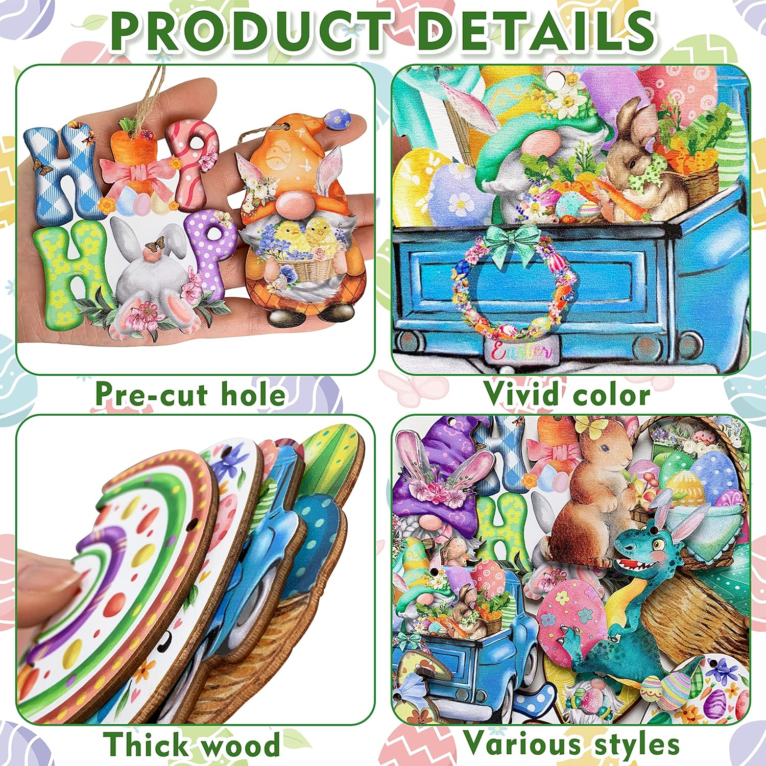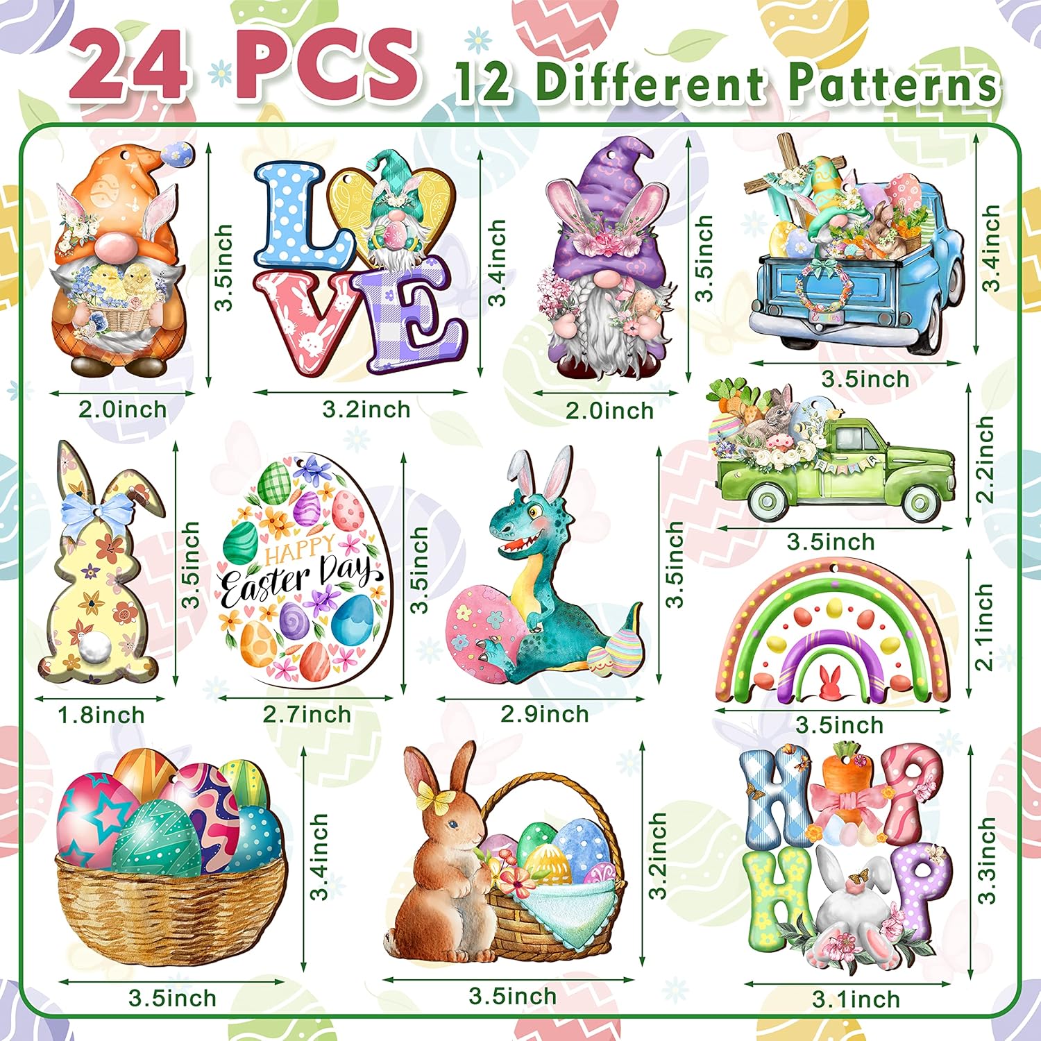 • New Designed Easter Wooden Tree Ornaments -- 24 PCS Easter wooden slices with exquisite workmanship in 12 different styles are made of high-quality wood, painting in front and empty at back.