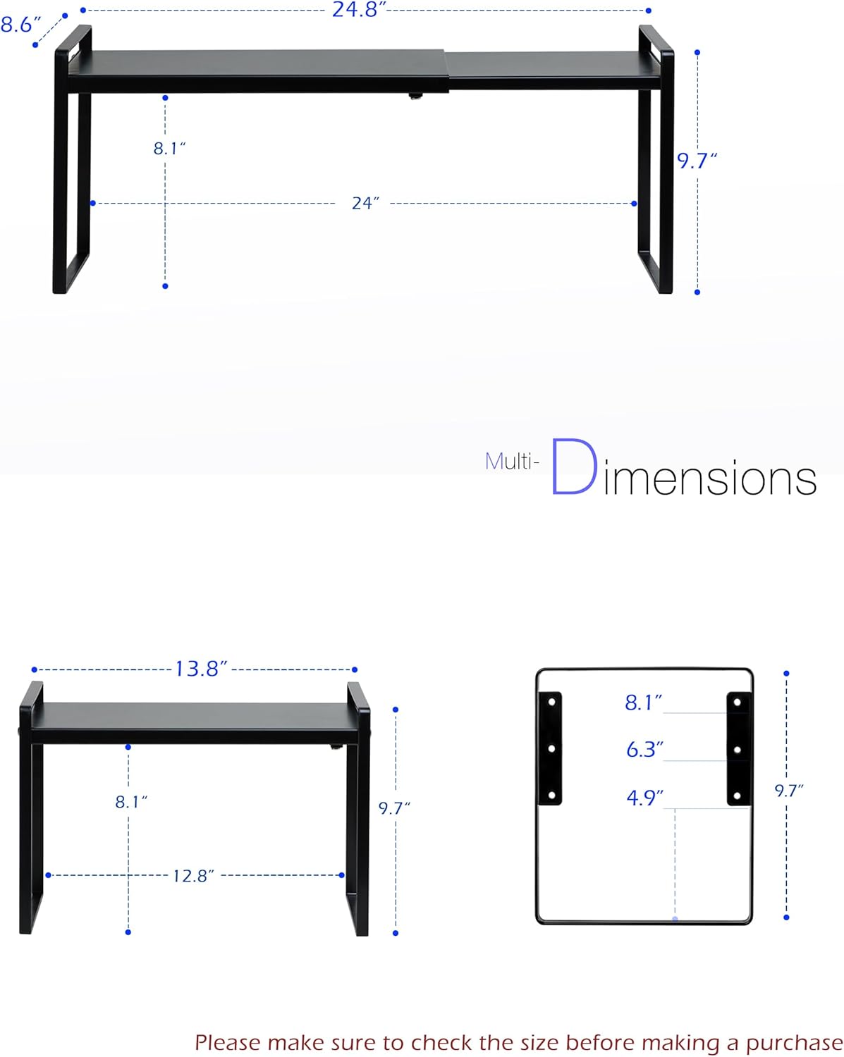 • SIZE: Width ranges from 13.8 inches to 24.8 inches. Depth is 8.6 inches. Height is 9.7 inches and can be adjusted to 4.9 inches, 6.3 inches, or 8.1 inches above the surface. It is easy to install and can be assembled within 2 minutes. All the necessary parts for installation are included in the package.