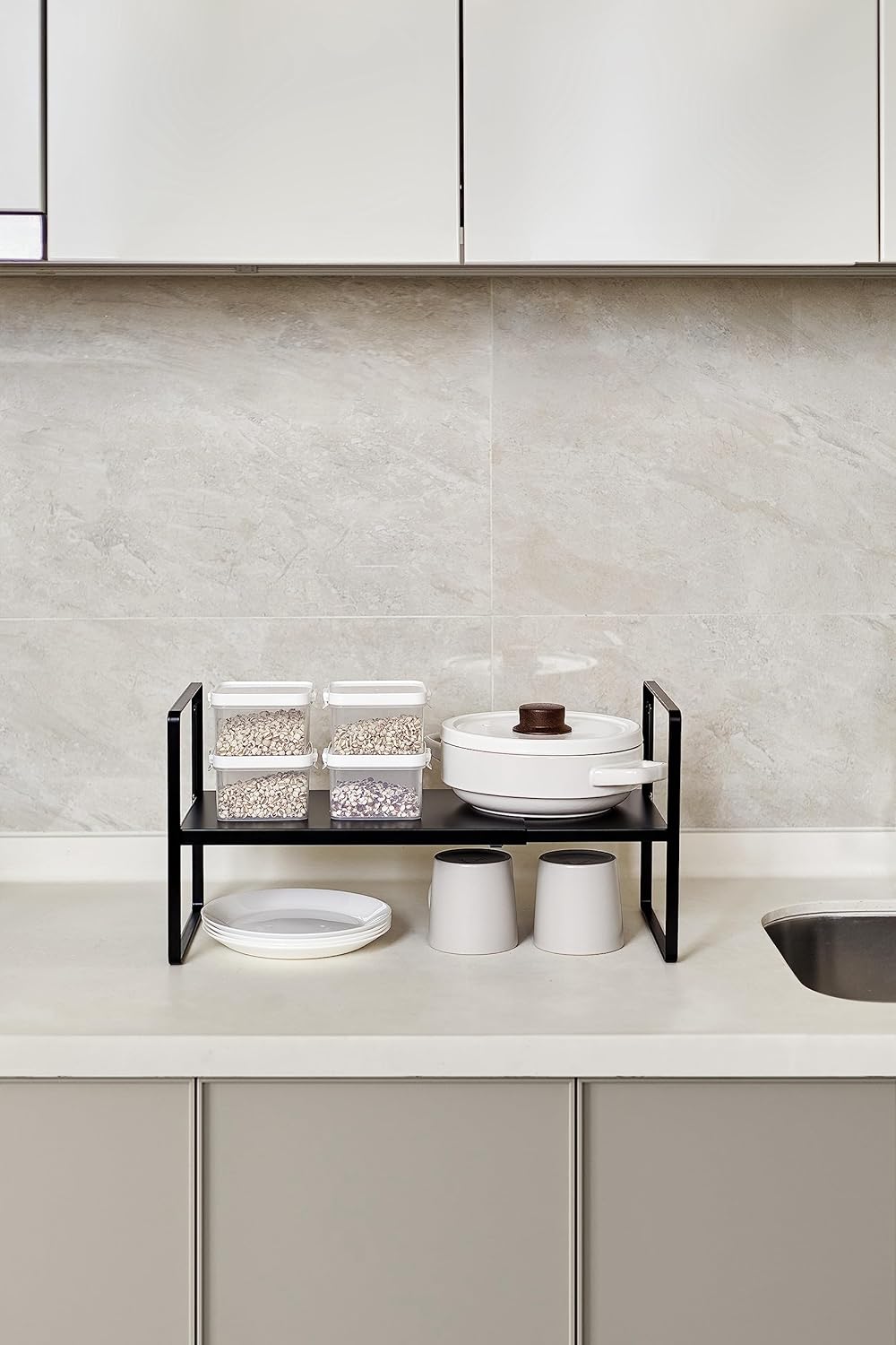 Nxconsu Cabinet Shelf Expandable Height Adjustable Organizer Riser for Kitchen Cabinet Pantry Cupboard Under Sink Countertop Organization Storage Space Saver Stackable Heavy Duty Metal Black