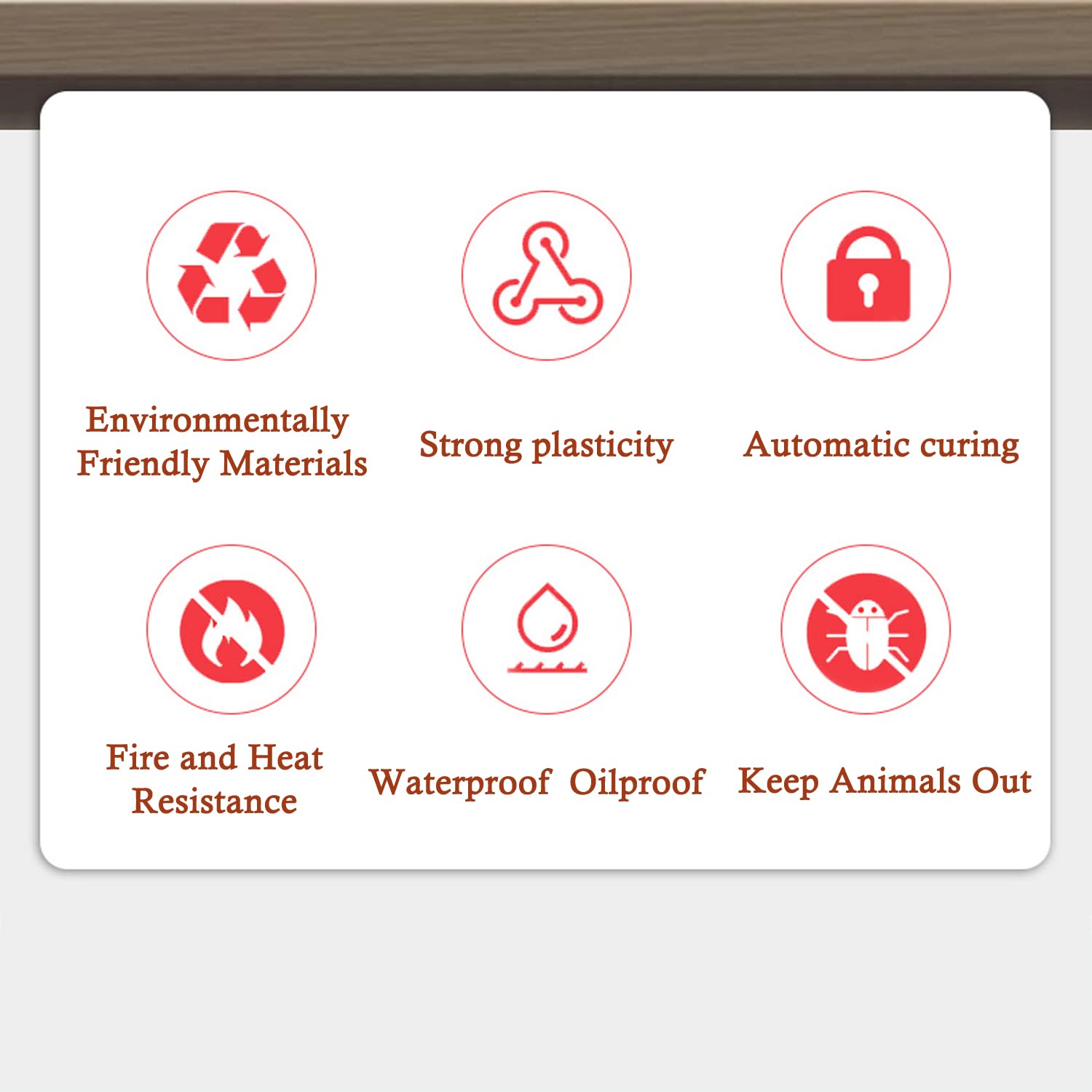 • Heat-resistant and flame-retardant, self-hardening, keep mosquitoes, spiders, snakes, etc. out.Tips:3-4 days needs for dry in winter,and not suit for repairing pipe leaking