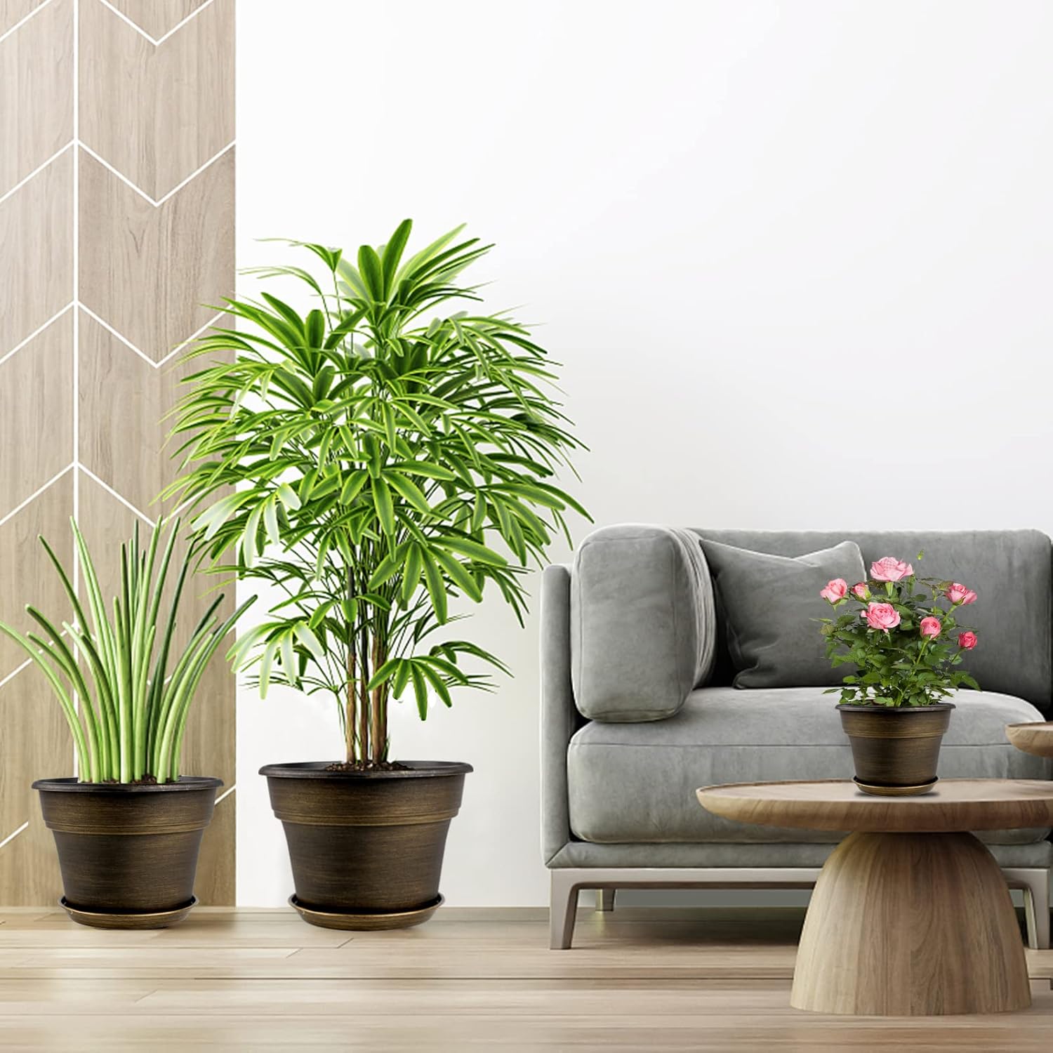 • 【TRADITIONAL DESIGN】Plastic planters for indoor plants with trays are designed in dark gold colors & a classic round look, which allow this pot to fit into any indoor & outdoor setting. With these golded flower pots, it could adds fresh, decorative flair to your home. Decorate your windowsill, desktop, shelf, bedroom, living room, kitchen, garden, office with our 9 inch plastic plant pot.
