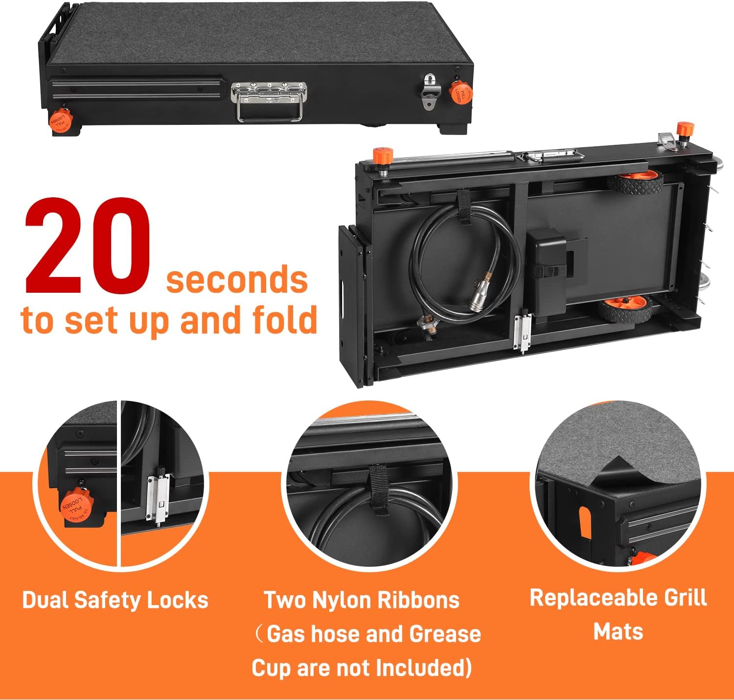 • The Best Blackstone Griddle Accessories - Exclusive Features lineup - Biggest Size in the Class, Double-shelf, Foldable caddy, Two 6" Wheels & Two Swivel Caster Wheel with Lock, Magnetic Tools Holder, Replaceable Table Mat, 2 Nylon Ribbon Strip for Propane Gas Hose & Grease Tray Management, Bottle Opener, Paper Towel Holder etc. Exclusive Dual Safety Features, Blackstone table individual safety lock for each legs frame, stainless steel lock to fix the position of legs frame during transportation. Applied for appearance patent.