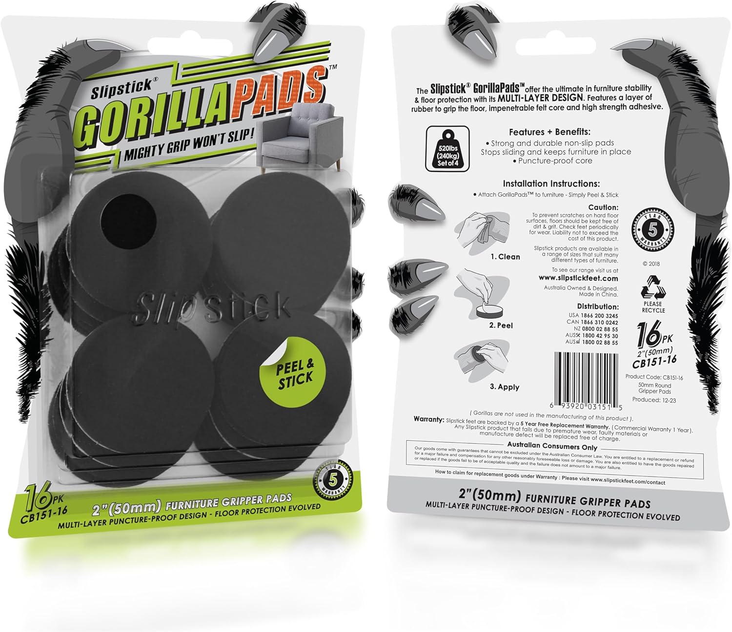 • Mighty grip that won’t slip – GorillaPad furniture grippers by Slipstick are the universal solution to stop furniture sliding and unwanted movement of furniture / objects and effectively protect all hard surfaces from scratches or damage. Includes 16 x 2” round non slip furniture pads