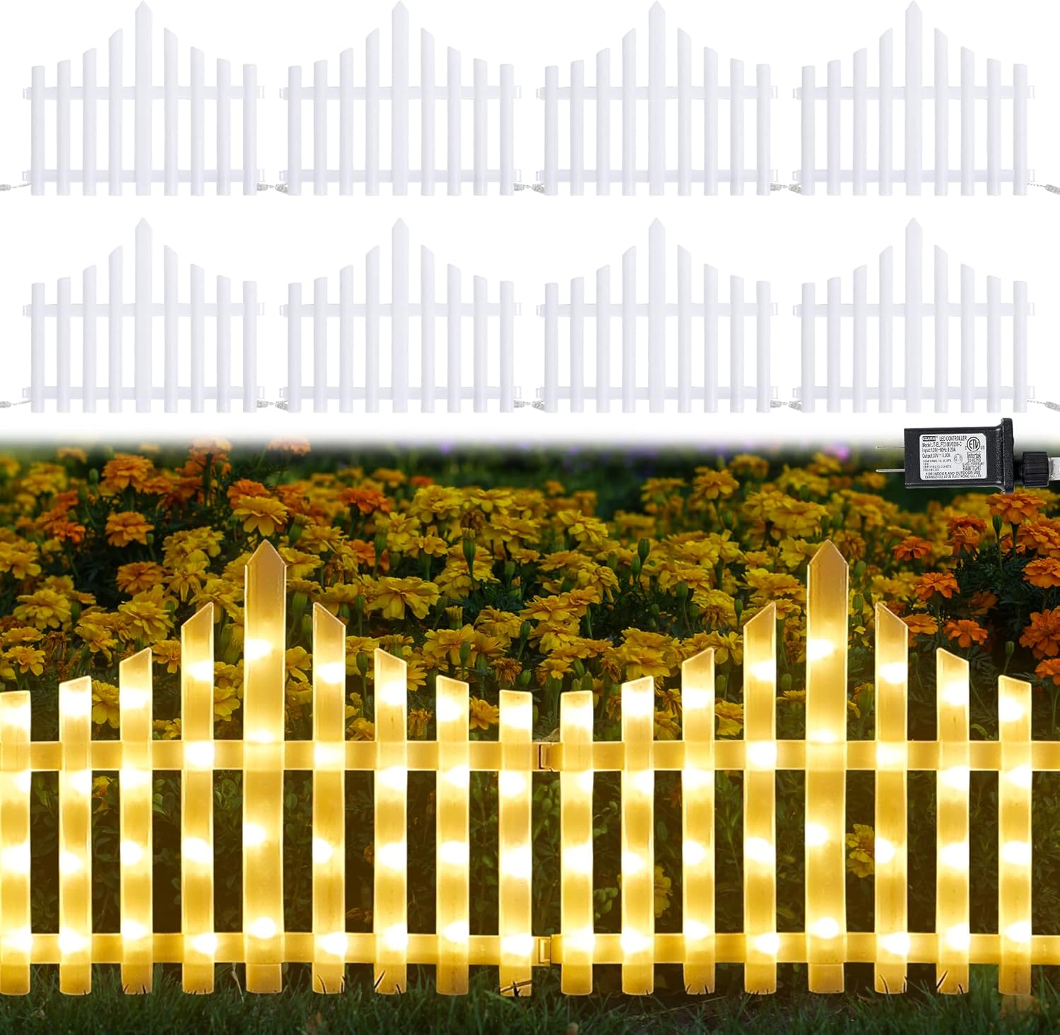 Hopolon 8 Pack 36LED Lighted Garden Fence,13.7x11.8inch Christmas Tree Fence Lights Plug in,8 Modes White Plastic Edgings Picket Decorative Fence for Landscape Patio Yard Path Home Xmas,Warm White