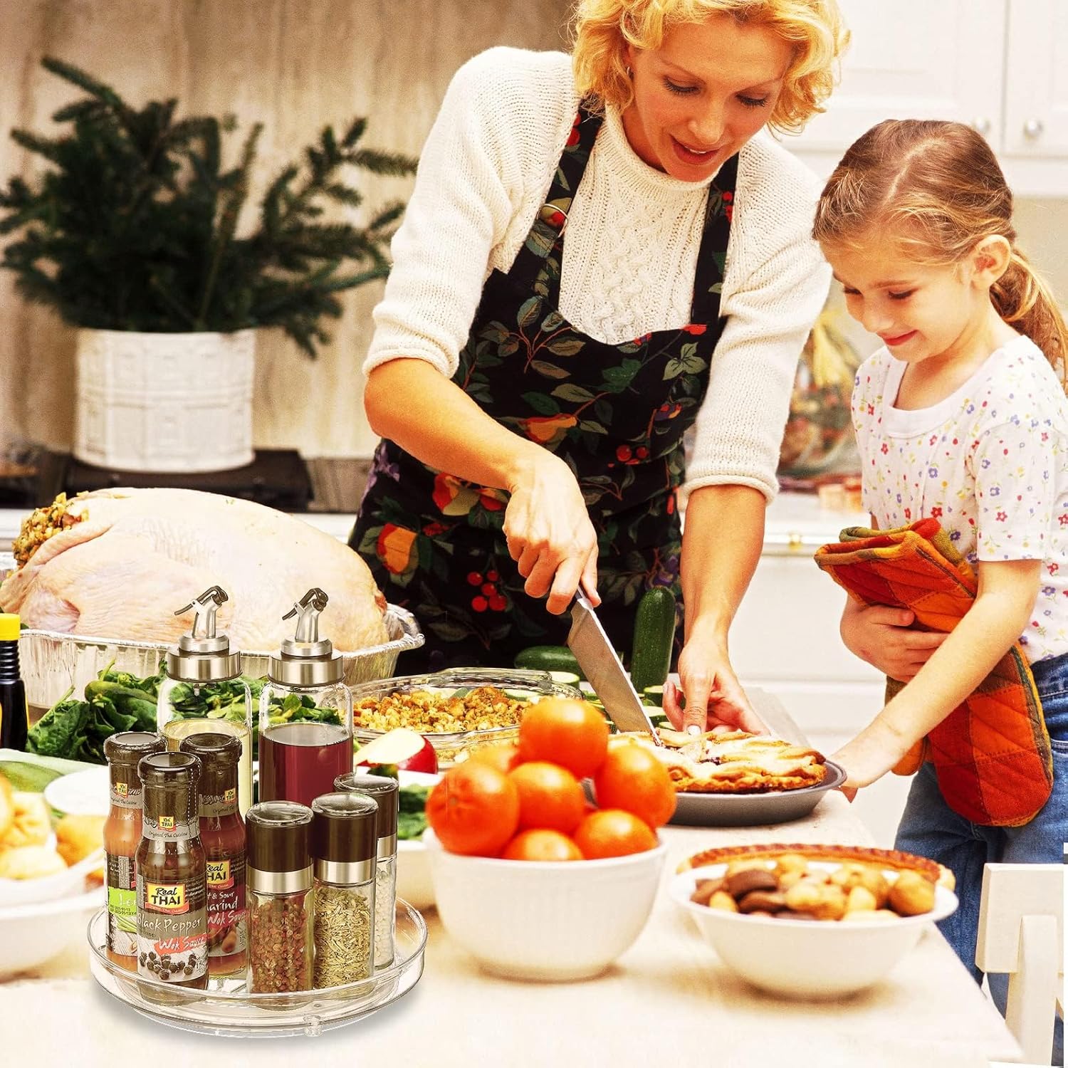 • 【MULTI-PURPOSE STORAGE】Perfect large lazy susan turntable for cabinet,kitchen, pantry, countertop, fridge, bathroom, bedroom, under the sink. It can fit condiments, spices, bottles, cans, drinks, snacks, makeups bath supplies, etc. The clear lazy susan organizer is also a light weight but sturdy tray when you want to move items.