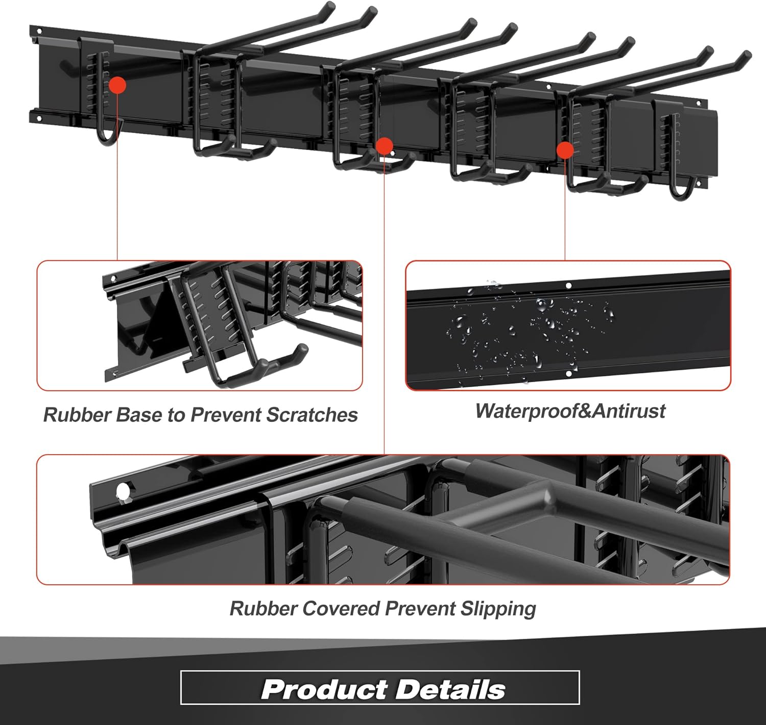Garage Tool Storage Rack, Heavy Duty Garage Storage Organizer Rack System Wall Mounted Tool with 6 double hooks, 2 rails, Garden Yard Tools Hanger Rack for Ski Gears, Broom, Rake,Shovel
